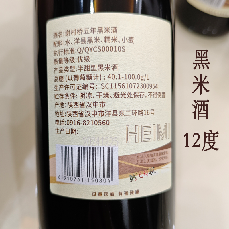 📚 黑米酒陕西汉中洋县特产谢村桥五年黑米黄酒12度半甜型740ml/瓶