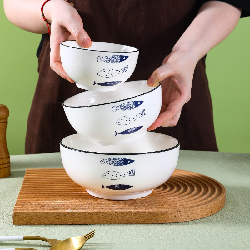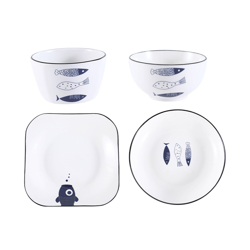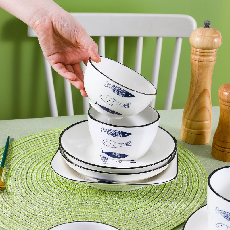 📚 年年有鱼创意陶瓷餐具家用碗盘碟组合卡通吃饭碗小清新面碗菜盘子