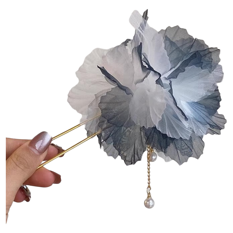 📚 青烟袅袅墨绿色网纱花朵珍珠流苏发簪气质新中式晕染花纱发钗簪子