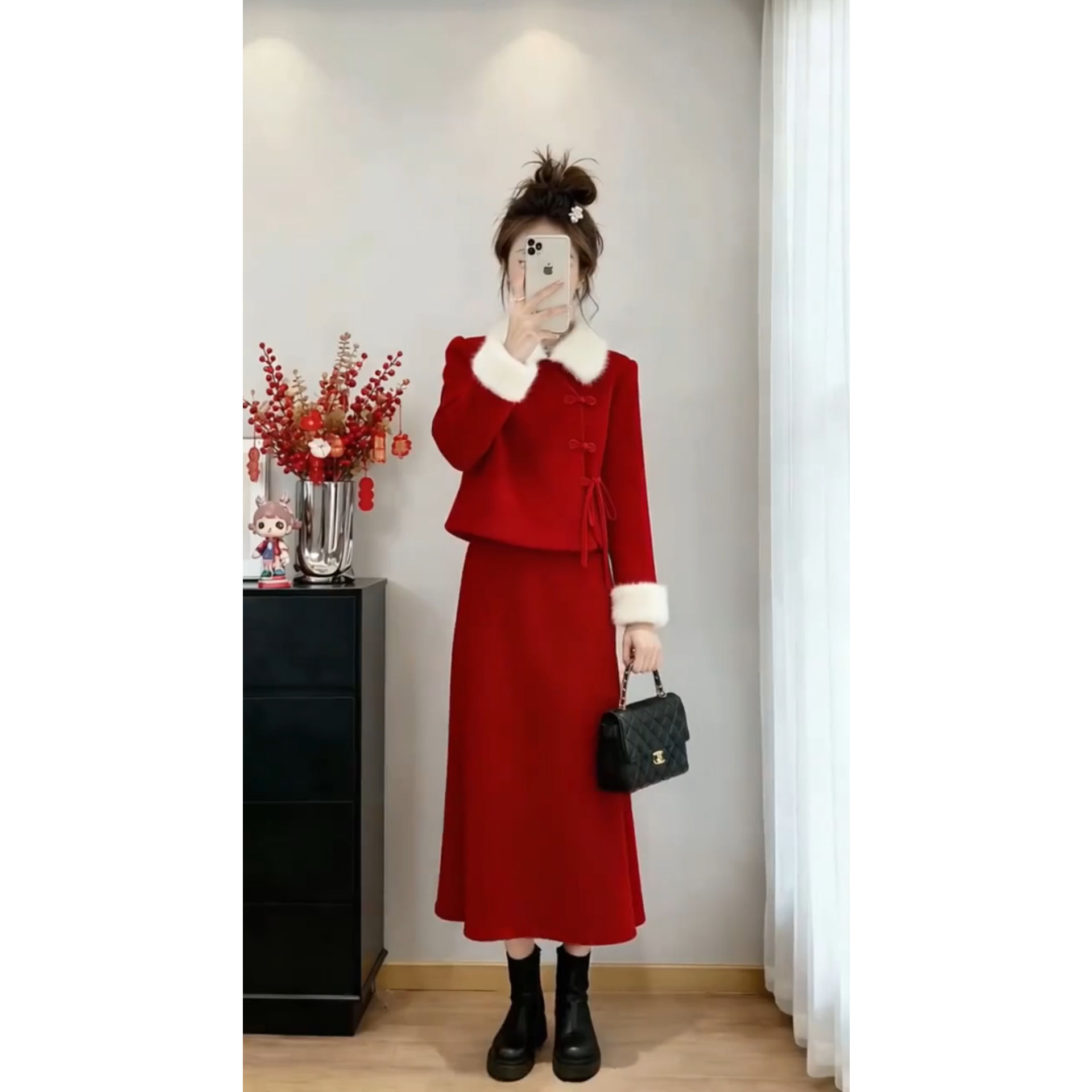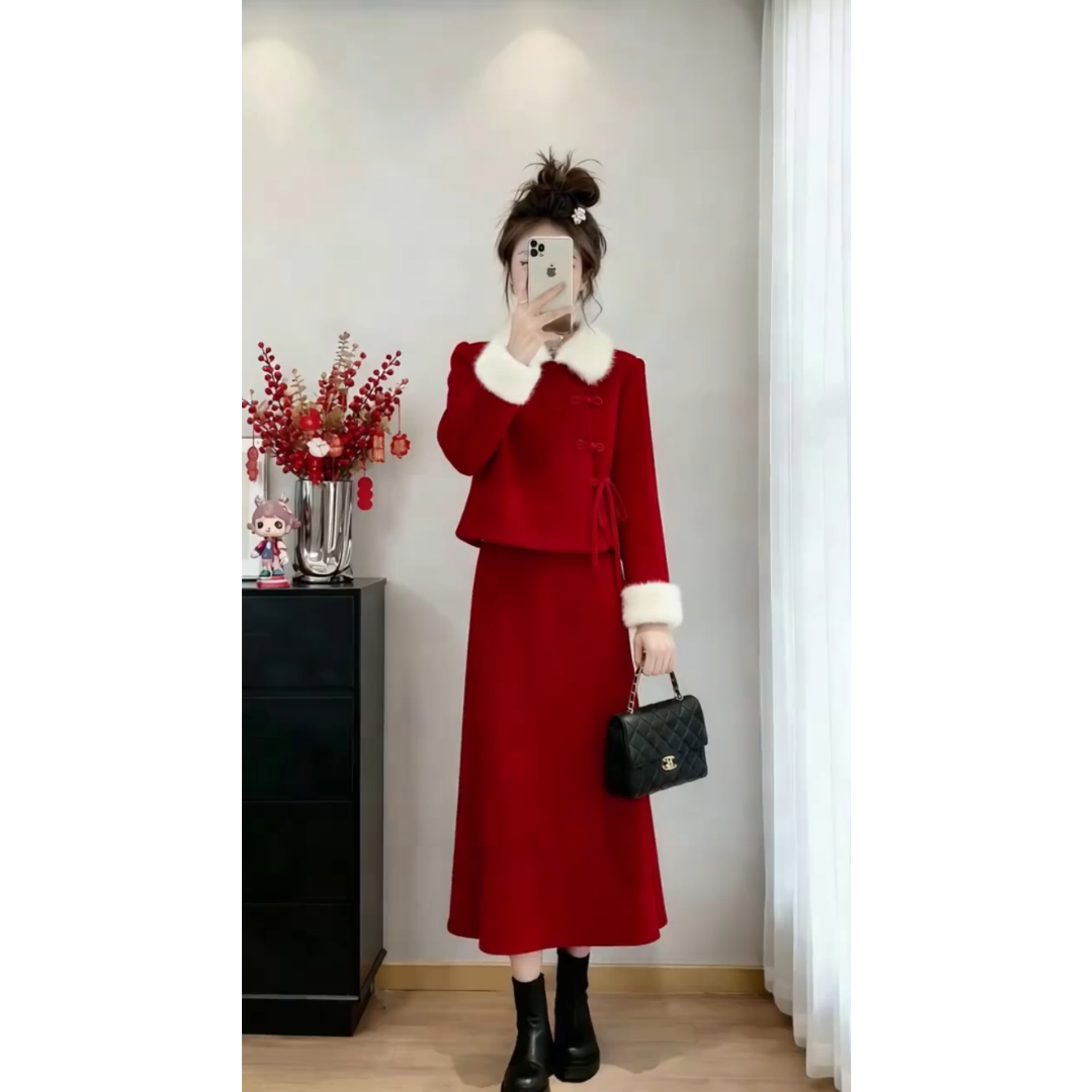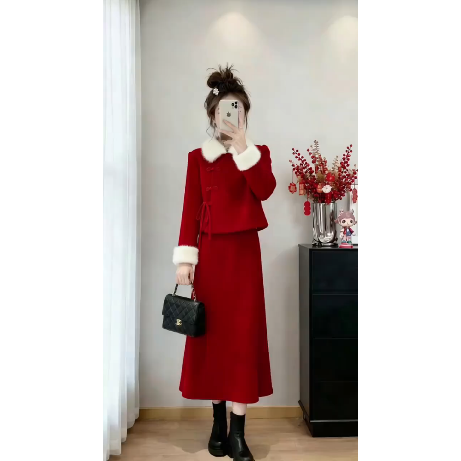 📚 新中式红色两件套女冬季毛绒翻领上衣半身裙套装氛围感保暖修身型