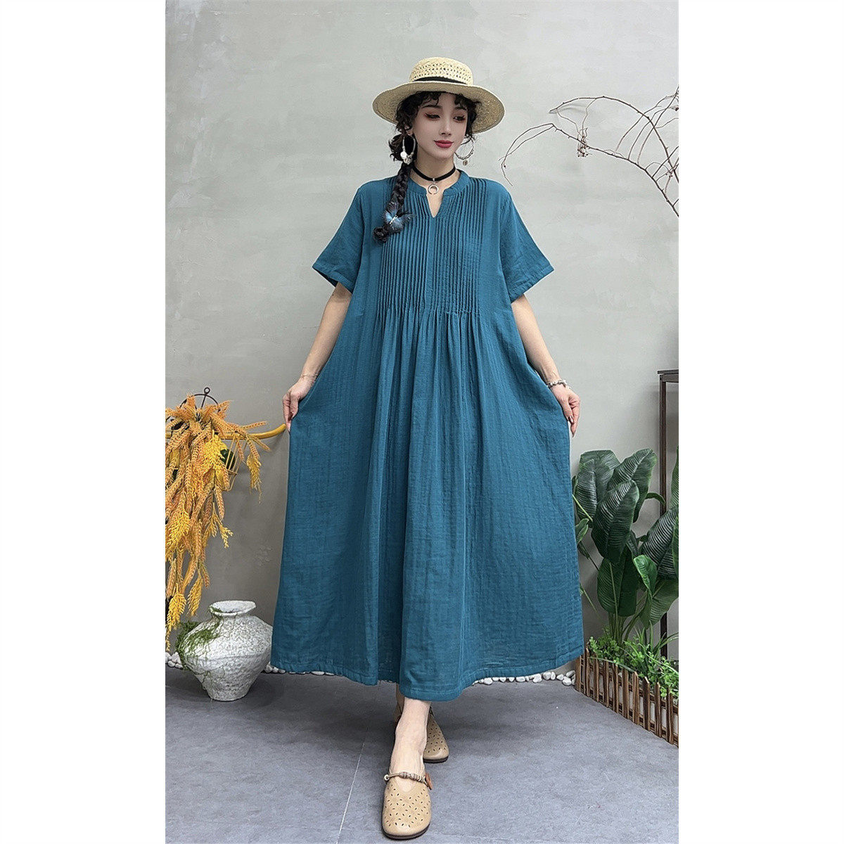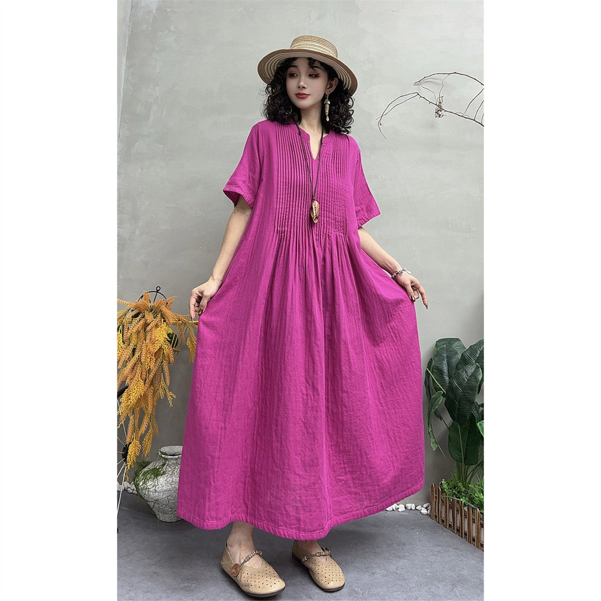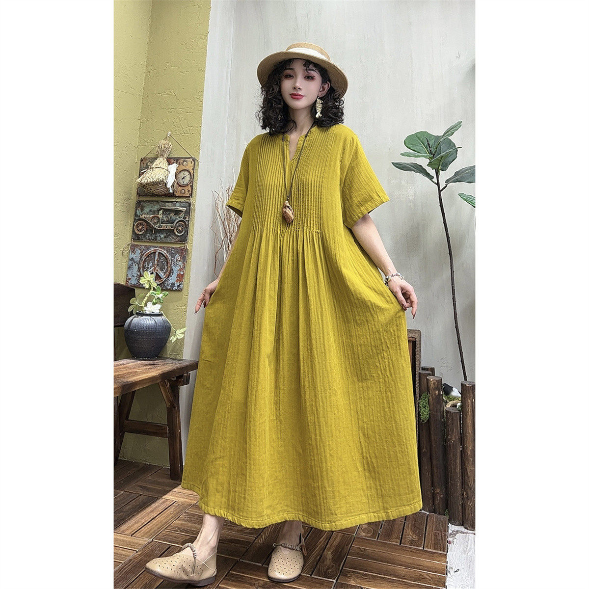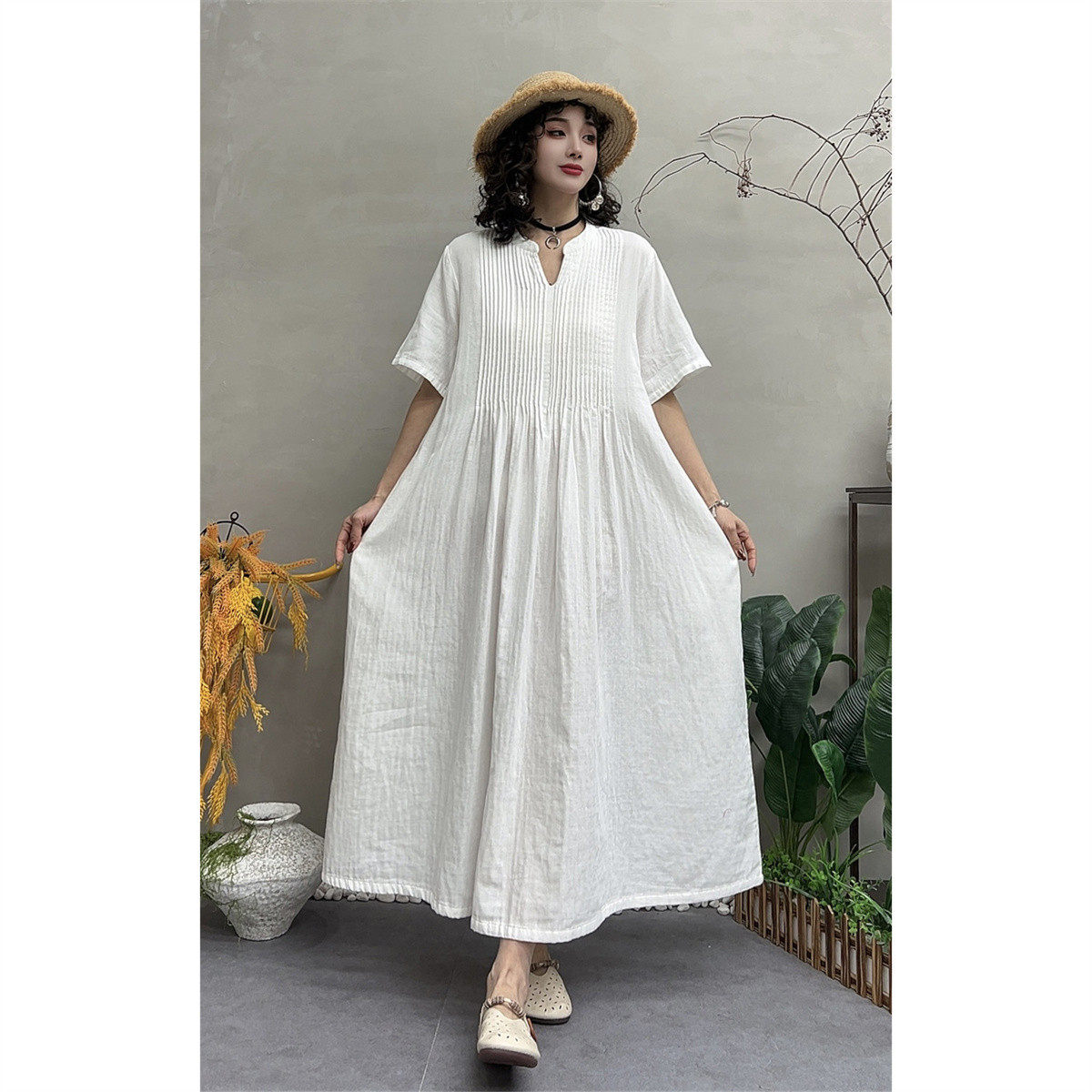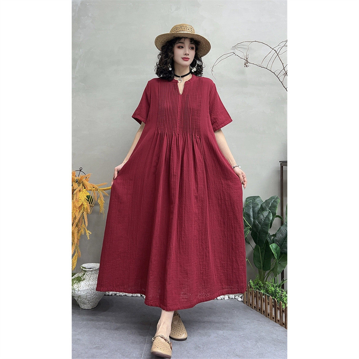 📚 夏季新款复古褶子双层棉纱V领短袖连衣裙女宽松显瘦大摆裙A字长裙