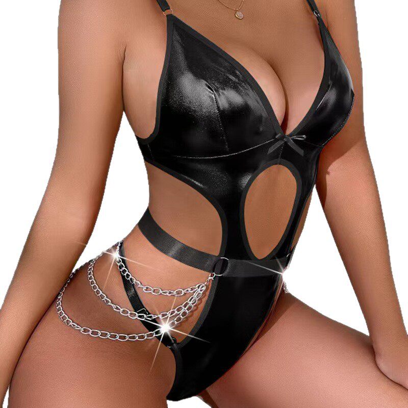 📚 Sexy Women's Leather Chain Cut-Out Bodysuit Set内衣漆皮套装