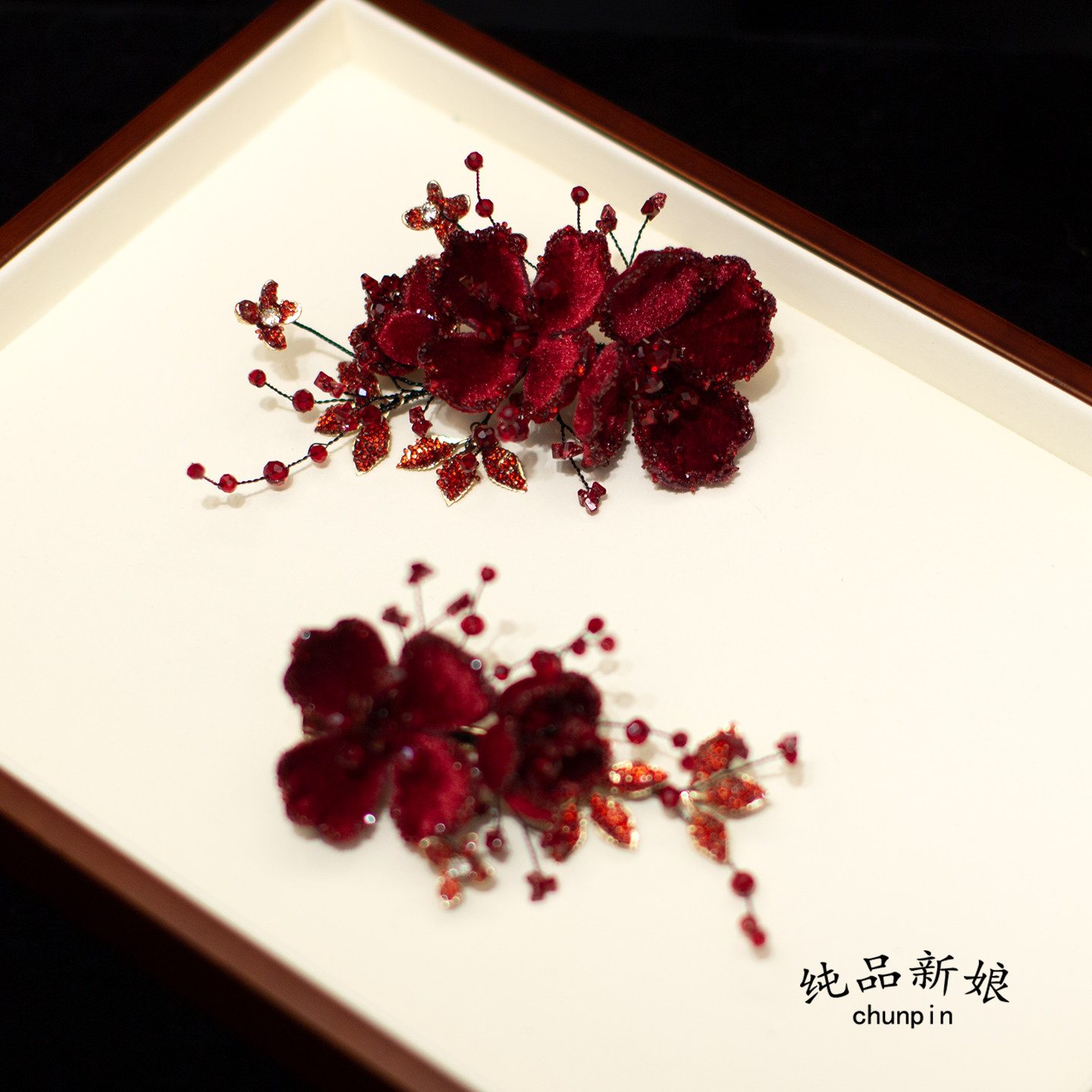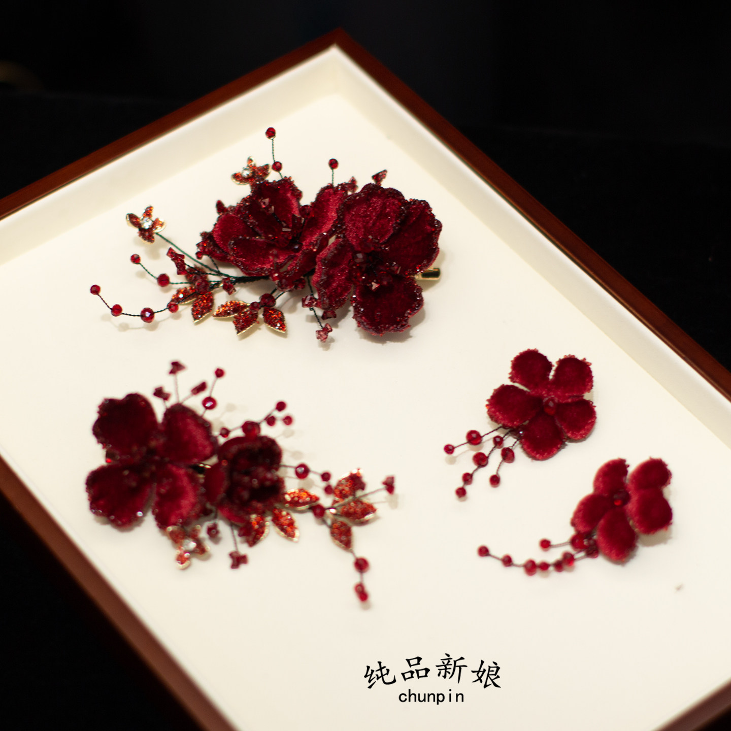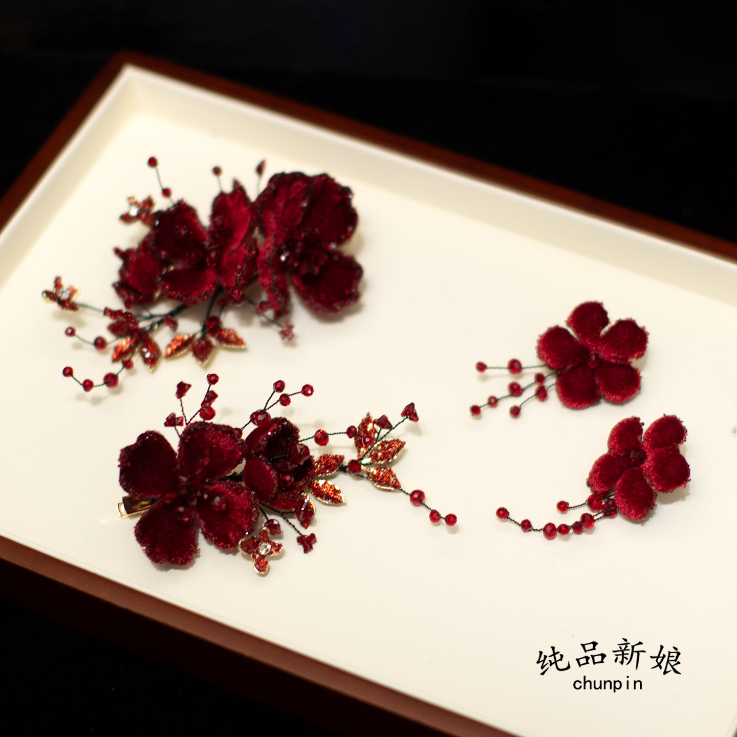 📚 新款高级新娘丝绒酒红色边夹头饰耳环套装晚礼服旗袍婚礼宴会配饰
