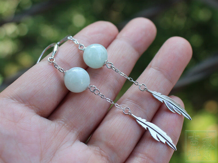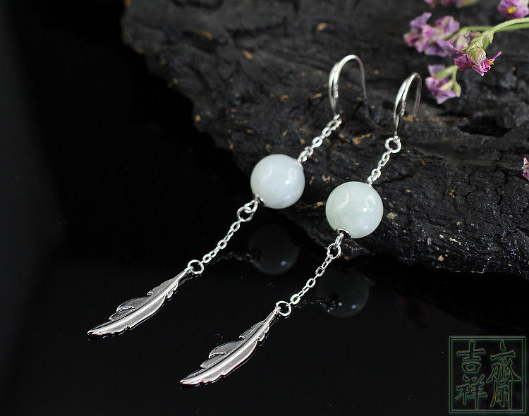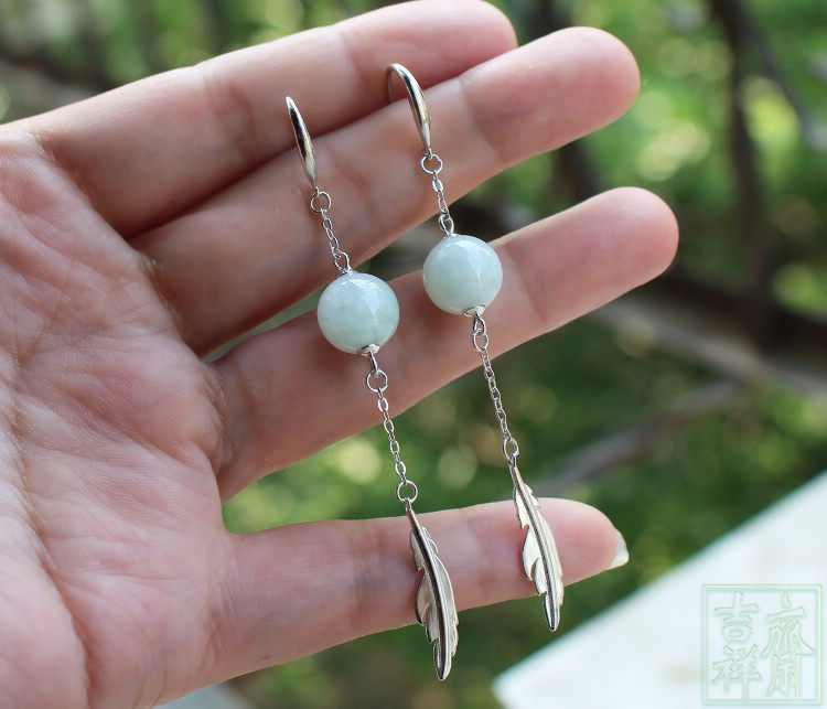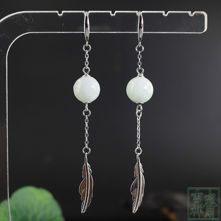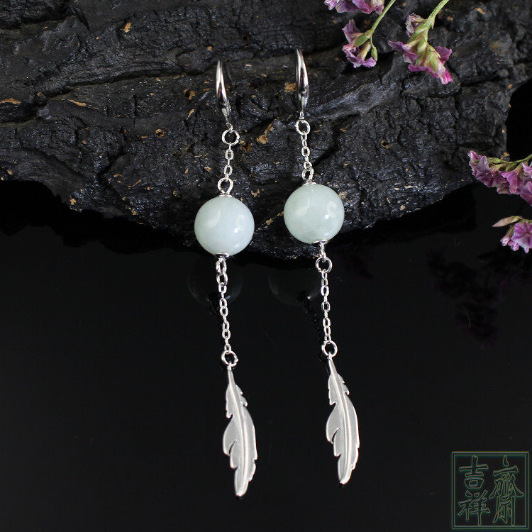 📚 天然缅甸翡翠a货玉耳环耳坠长款古典玉耳饰汉服耳环包邮925银叶子