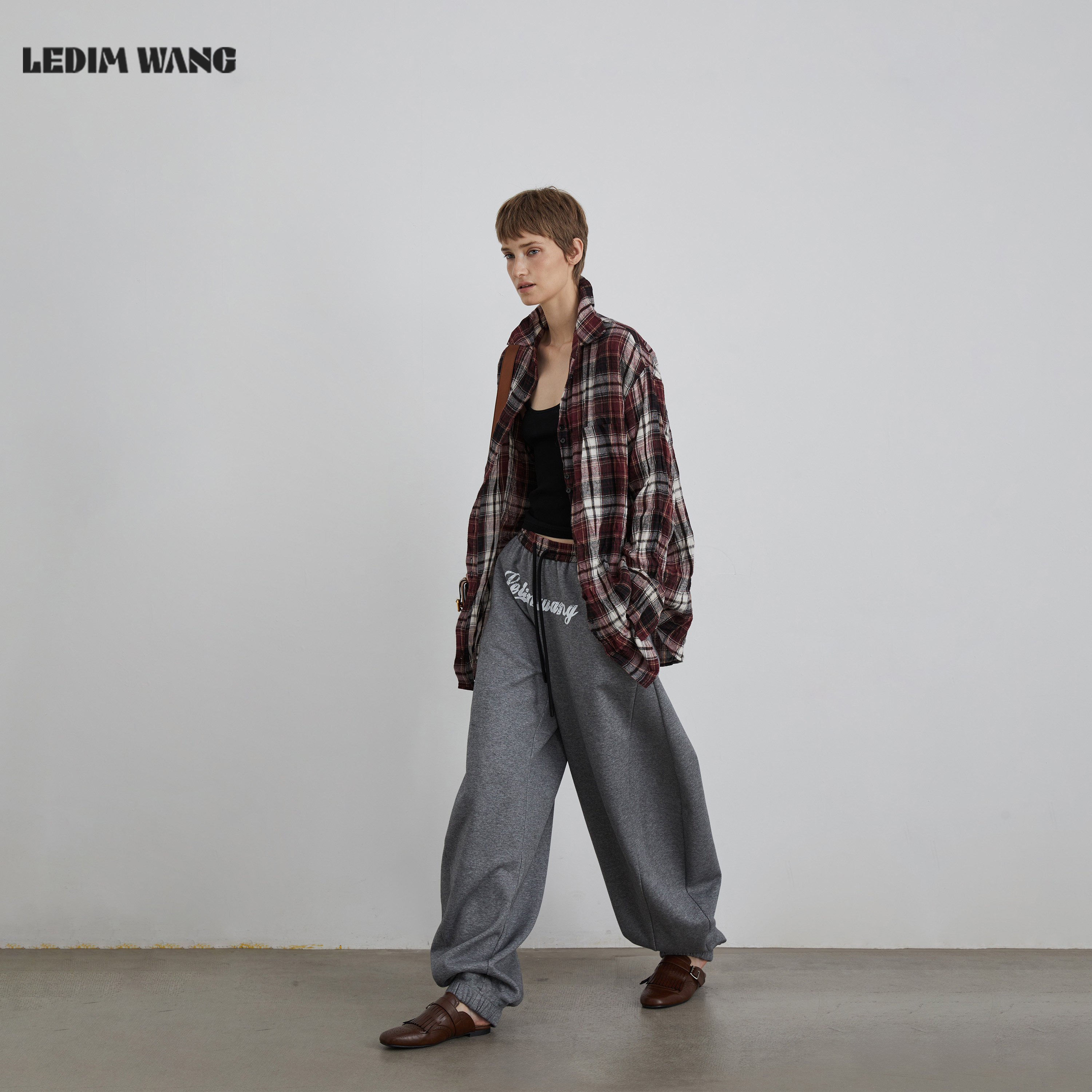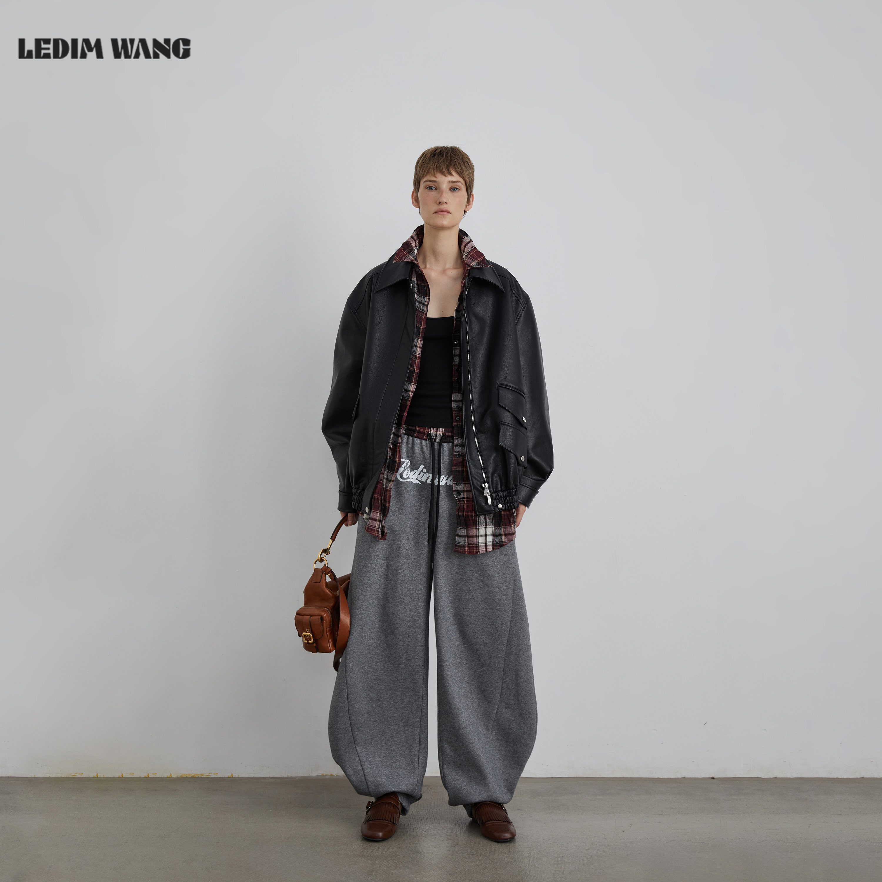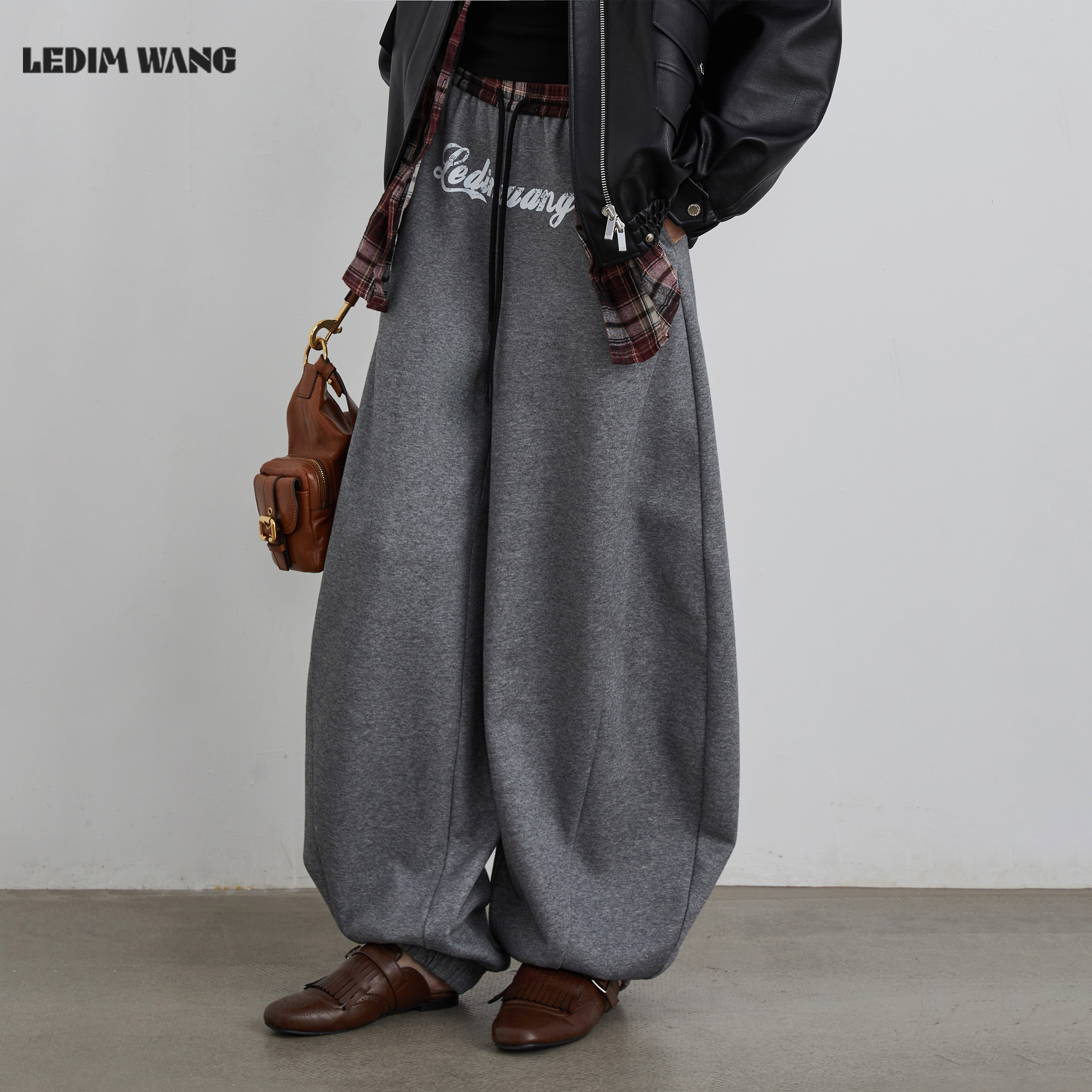 📚 LEDIM WANG白标/复古美式加绒弯刀卫裤女25秋冬新款灰色阔腿长裤