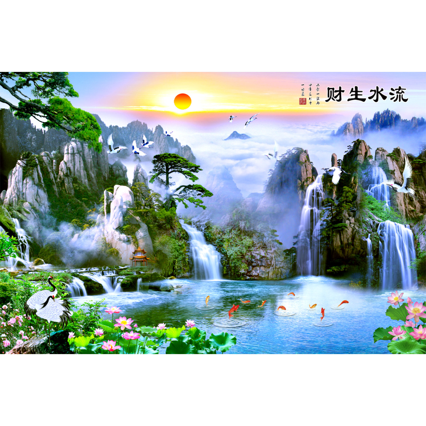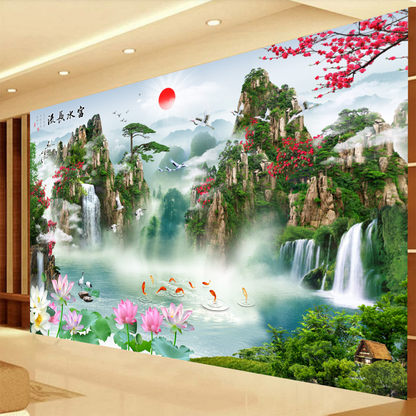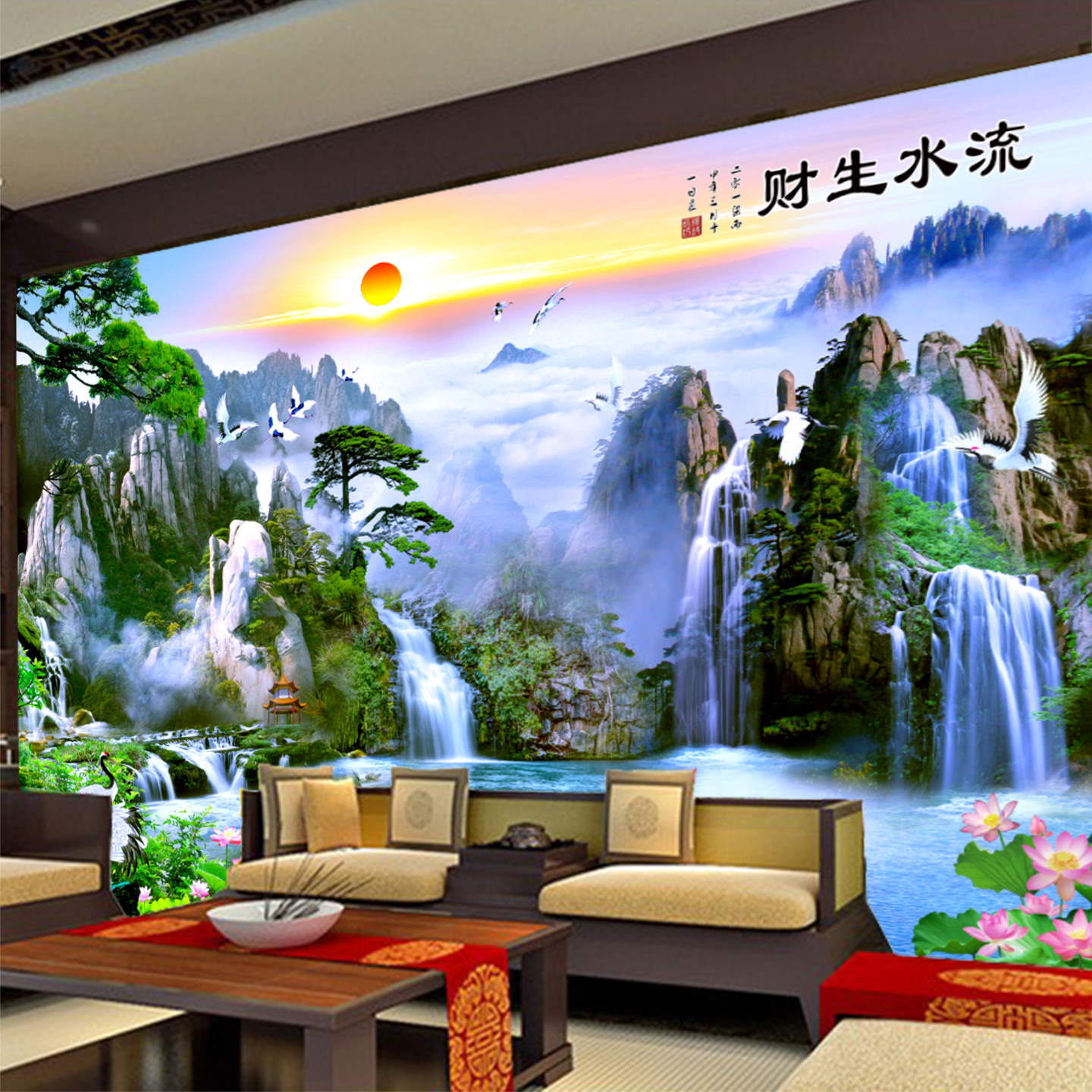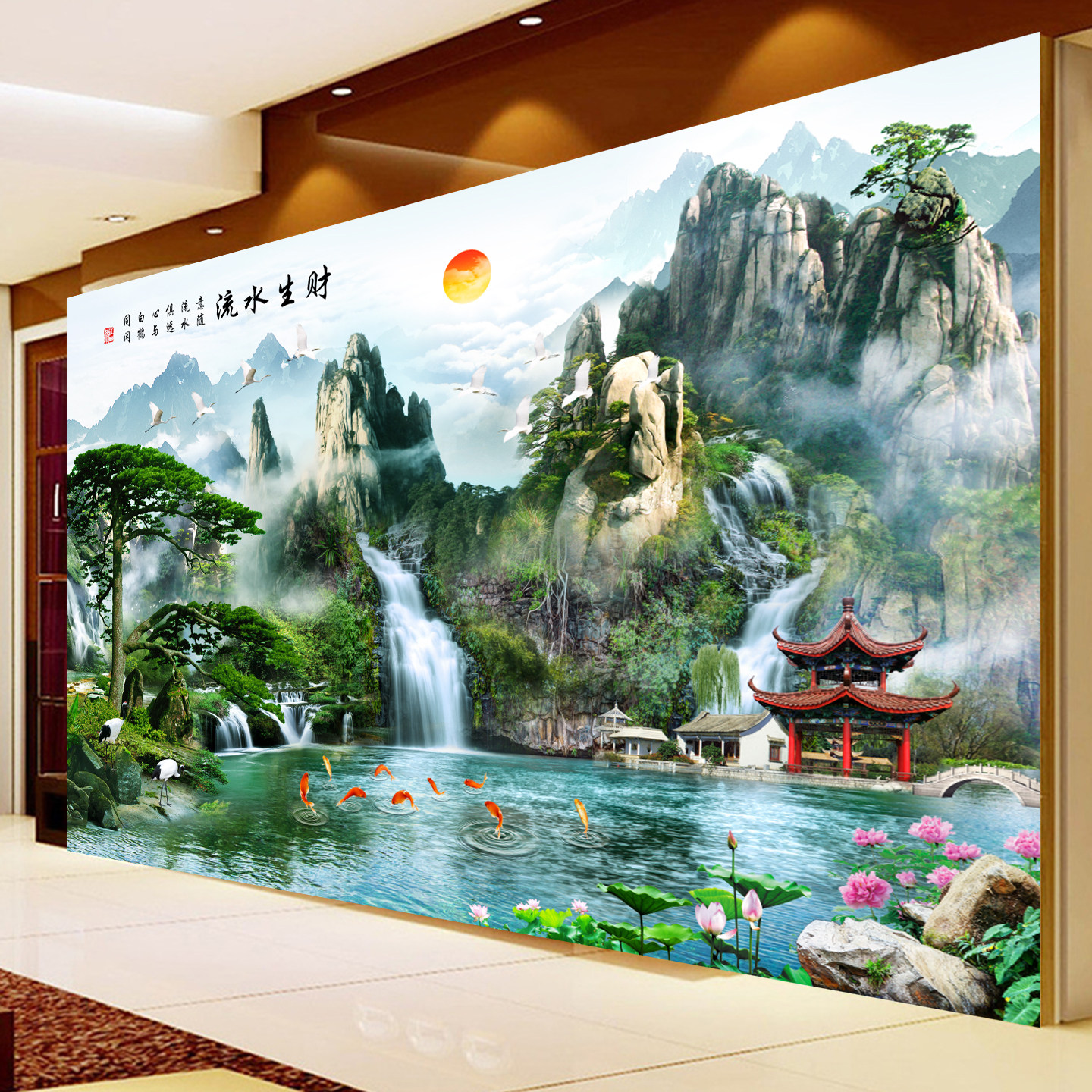 📚 中式流水生财山水画背景墙纸高山仙鹤游鱼壁纸佛仙堂办公室壁画