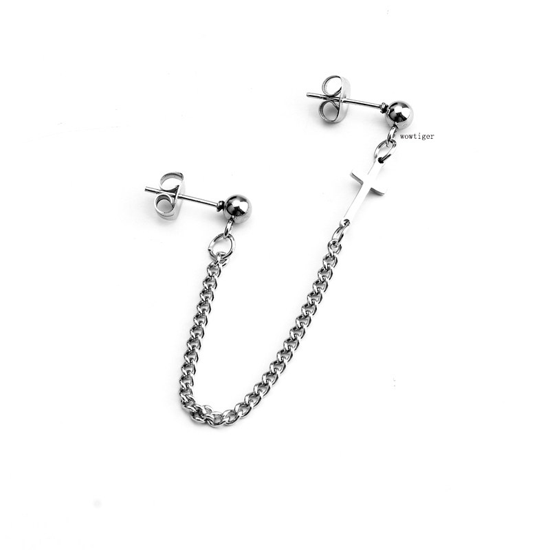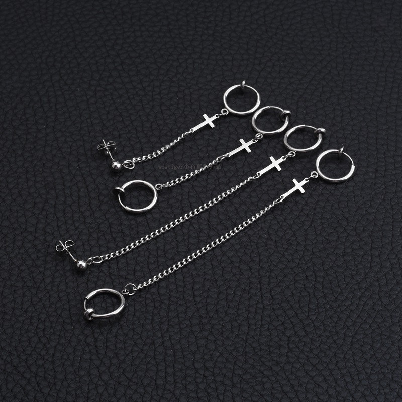 📚 朋克金属双耳洞耳环潮流男女一体式耳链耳骨夹简约十字架流苏耳饰