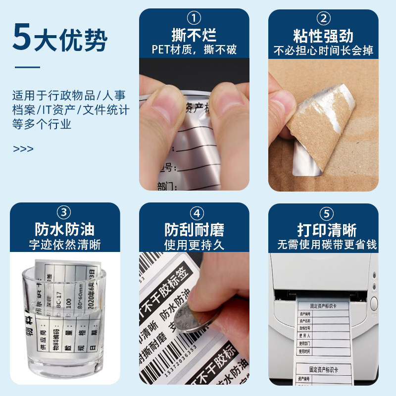 📚 三防热敏亚银纸标签纸40*30 50 20 70*60*80 90 100不干胶条码打印机防水油五防撕不烂固定资产哑银色贴纸150