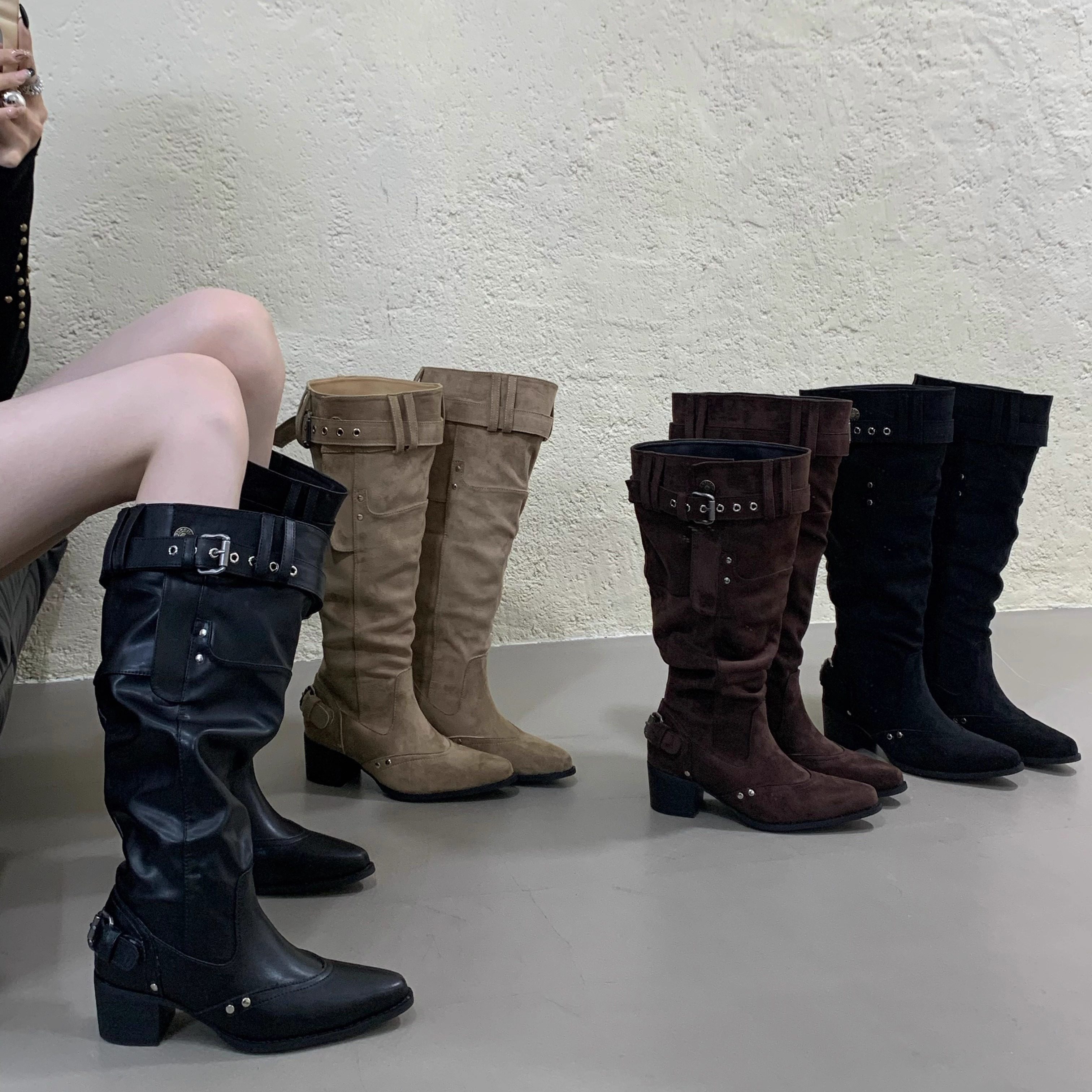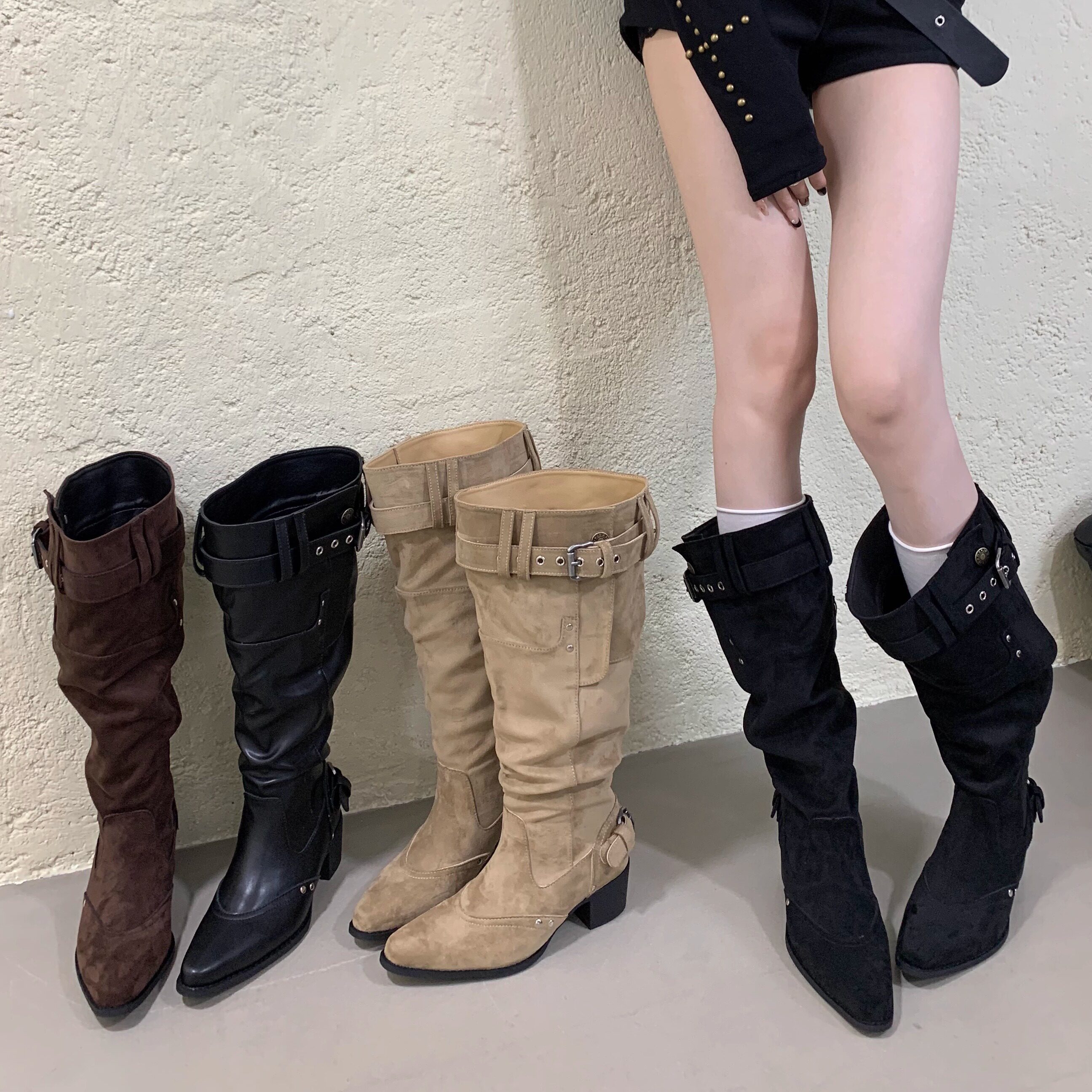 📚 2025冬新款褶皱堆堆靴欧美西部牛仔靴粗跟长筒骑士长靴子女不过膝