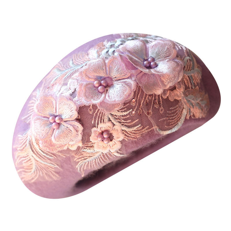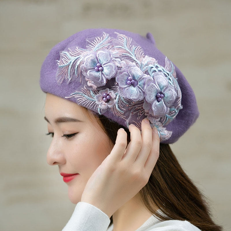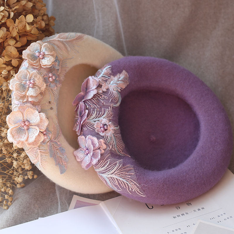 📚 森系紫色羊毛呢贝雷帽手工钉珠蕾丝刺绣立体花朵画家帽女秋冬日系