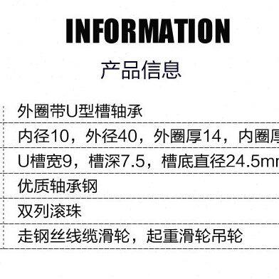 📚 外圈带槽钢轮 U型槽线缆走钢丝绳矫直滑轮轴承尺寸10*40*14/16mm