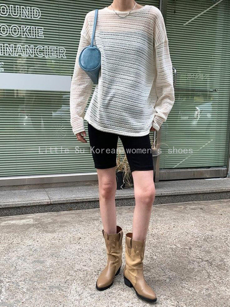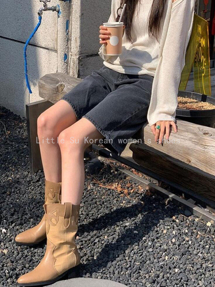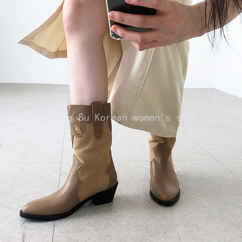 📚 小小苏东大门春新尖头拼色西部牛仔靴女粗跟中筒靴百搭显瘦马丁靴
