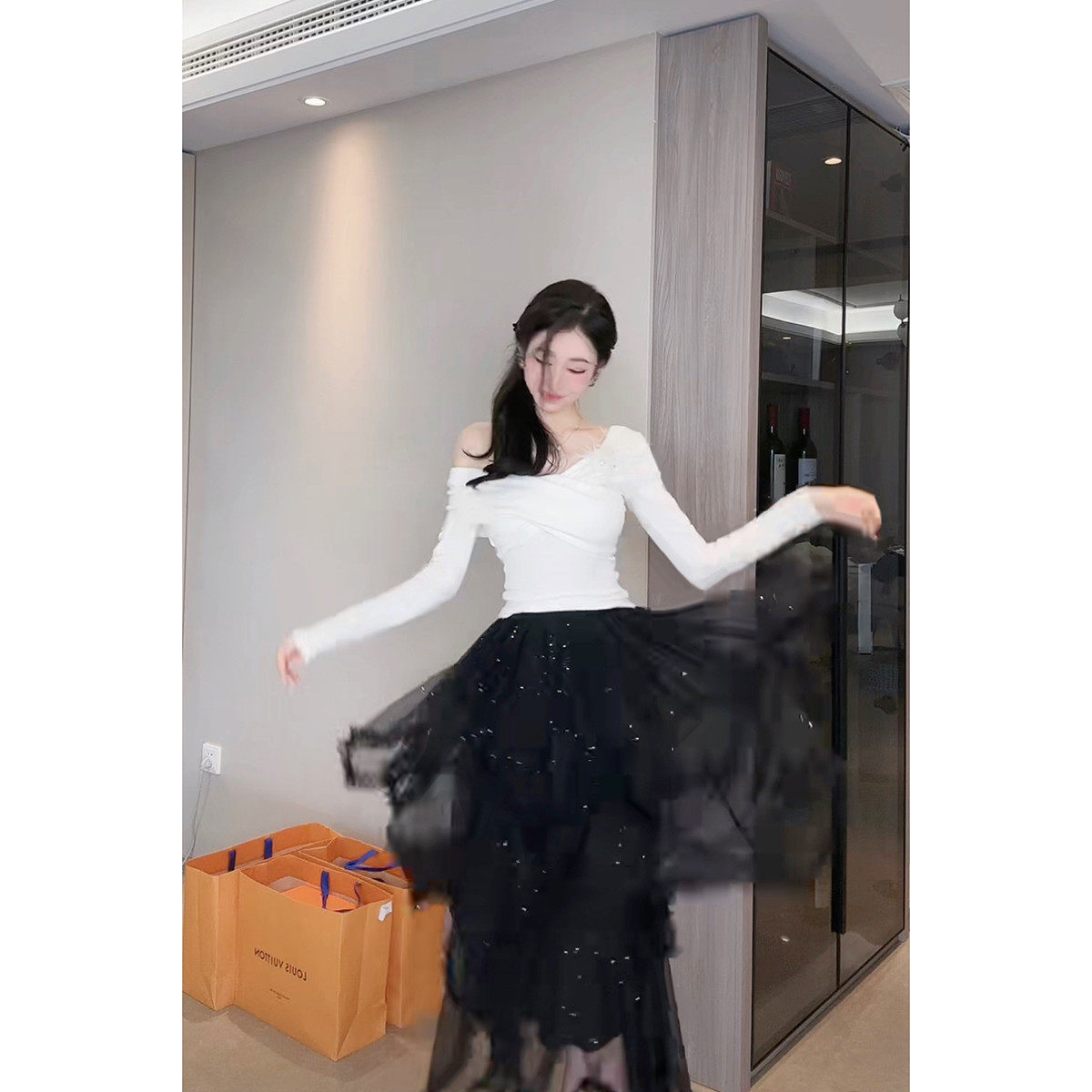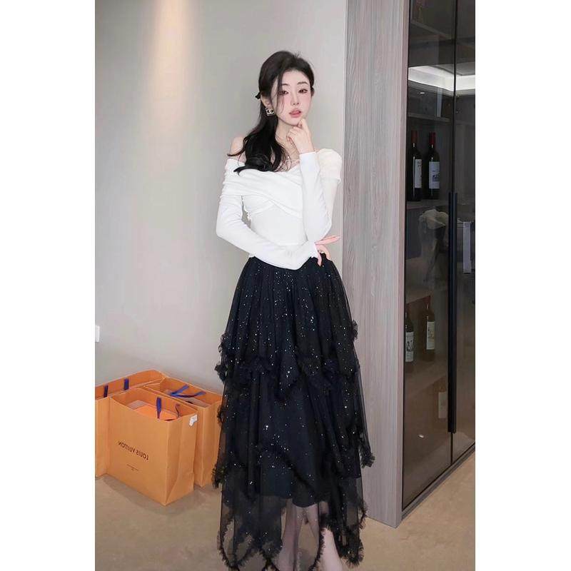 📚 Sun雅乔【星空裙】韩系显瘦A字裙仙女不规则亮片纱裙黑色半身