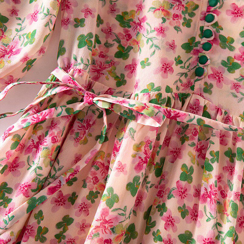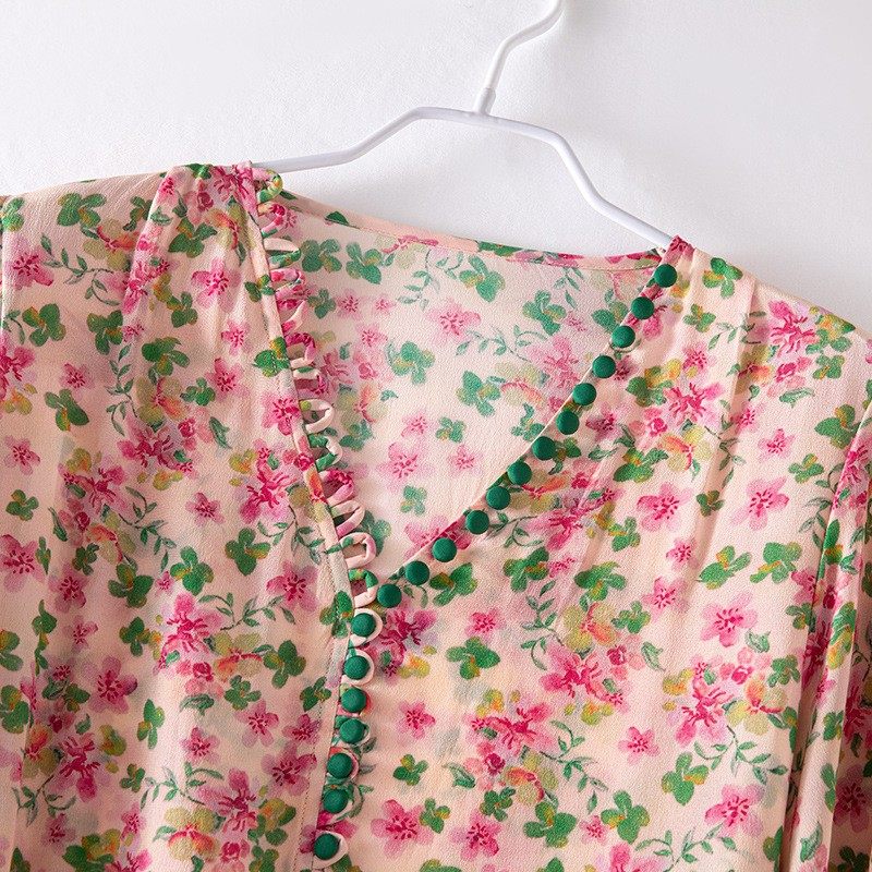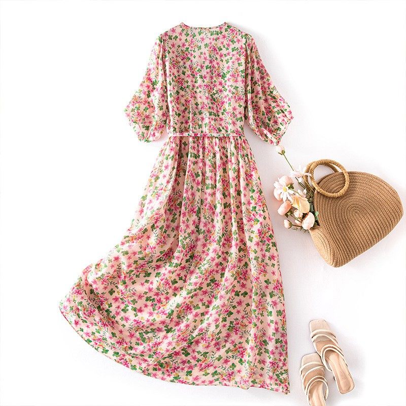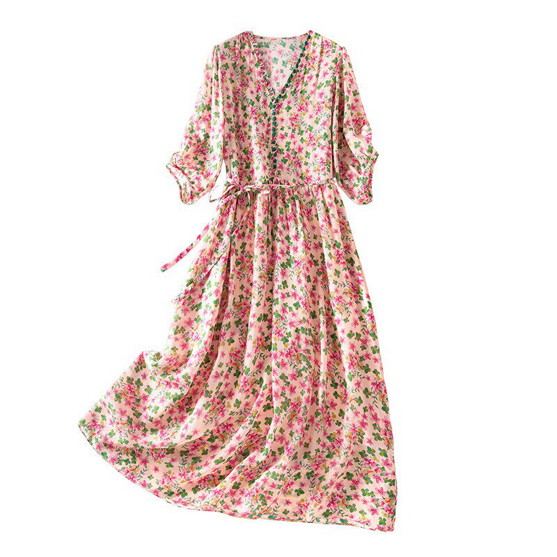 📚 轻奢真丝双绉桑蚕丝连衣裙女夏26新款V领系带小碎花显白中长A字裙