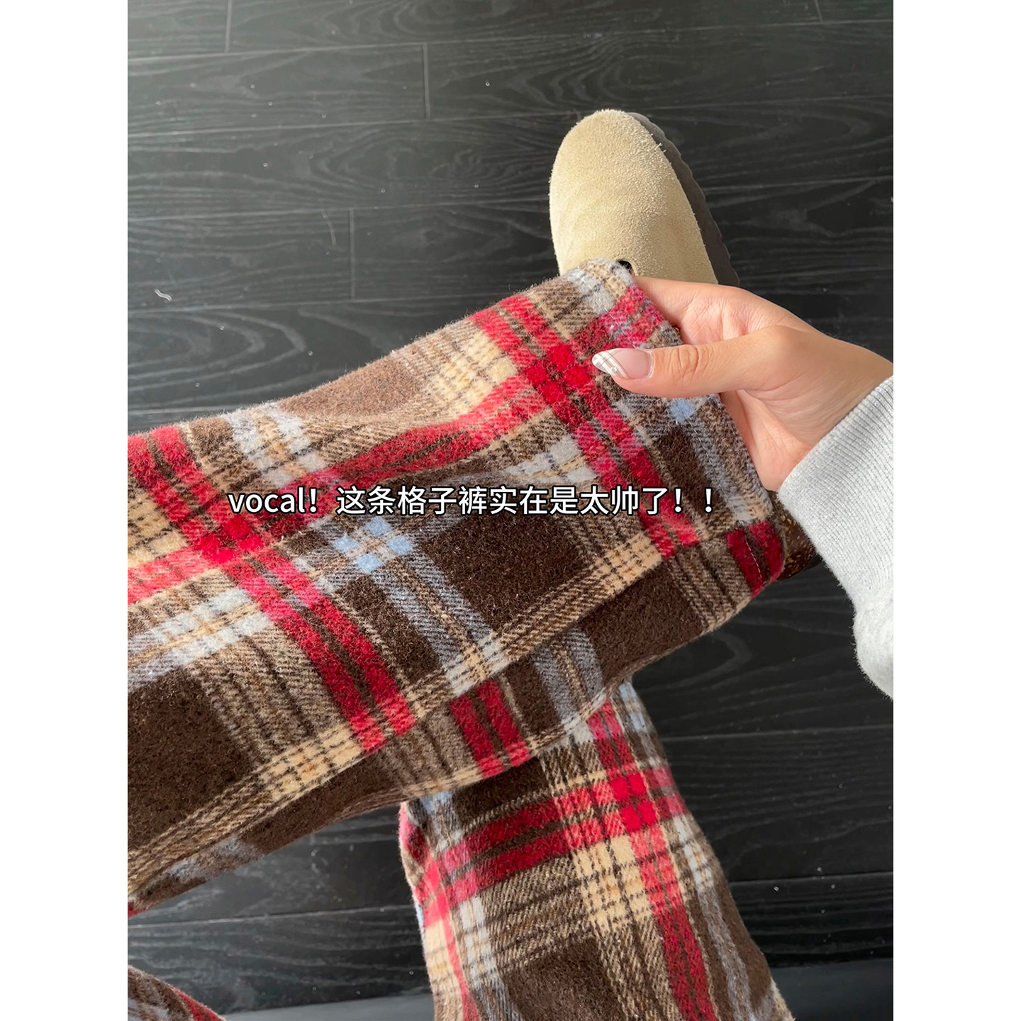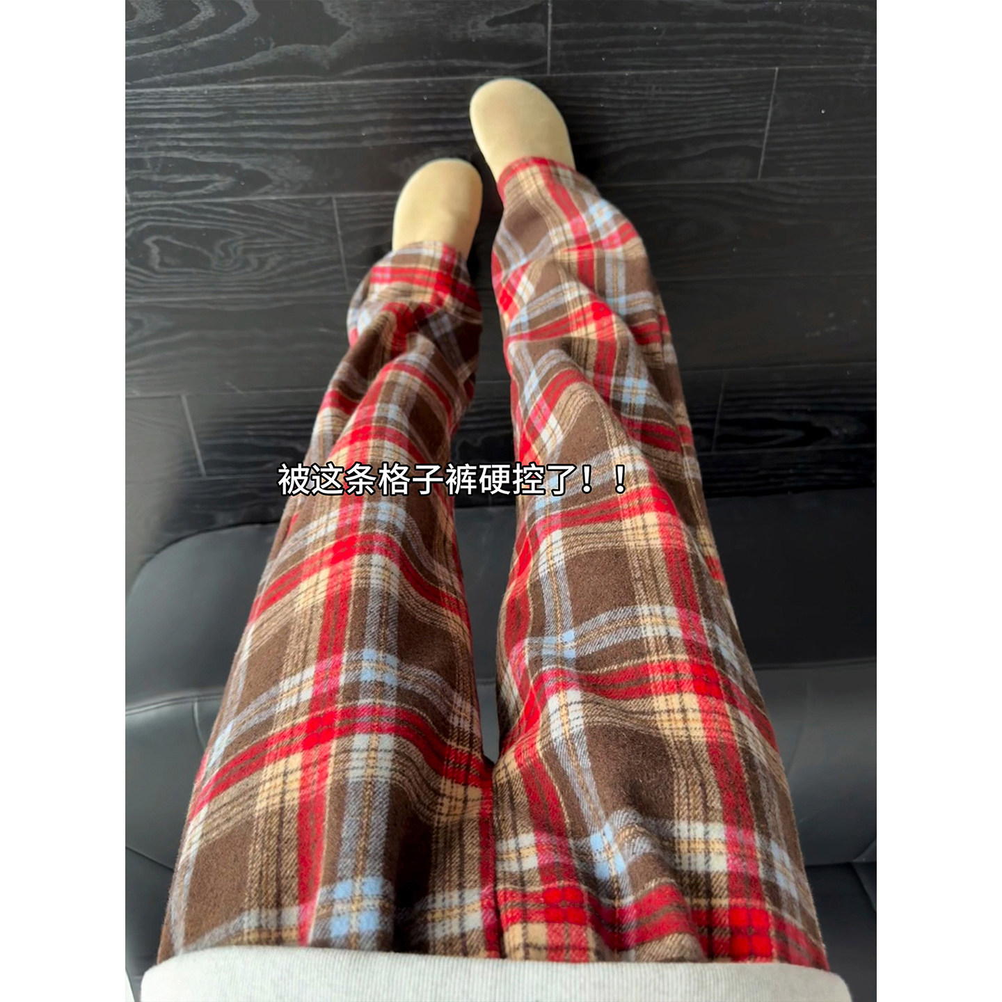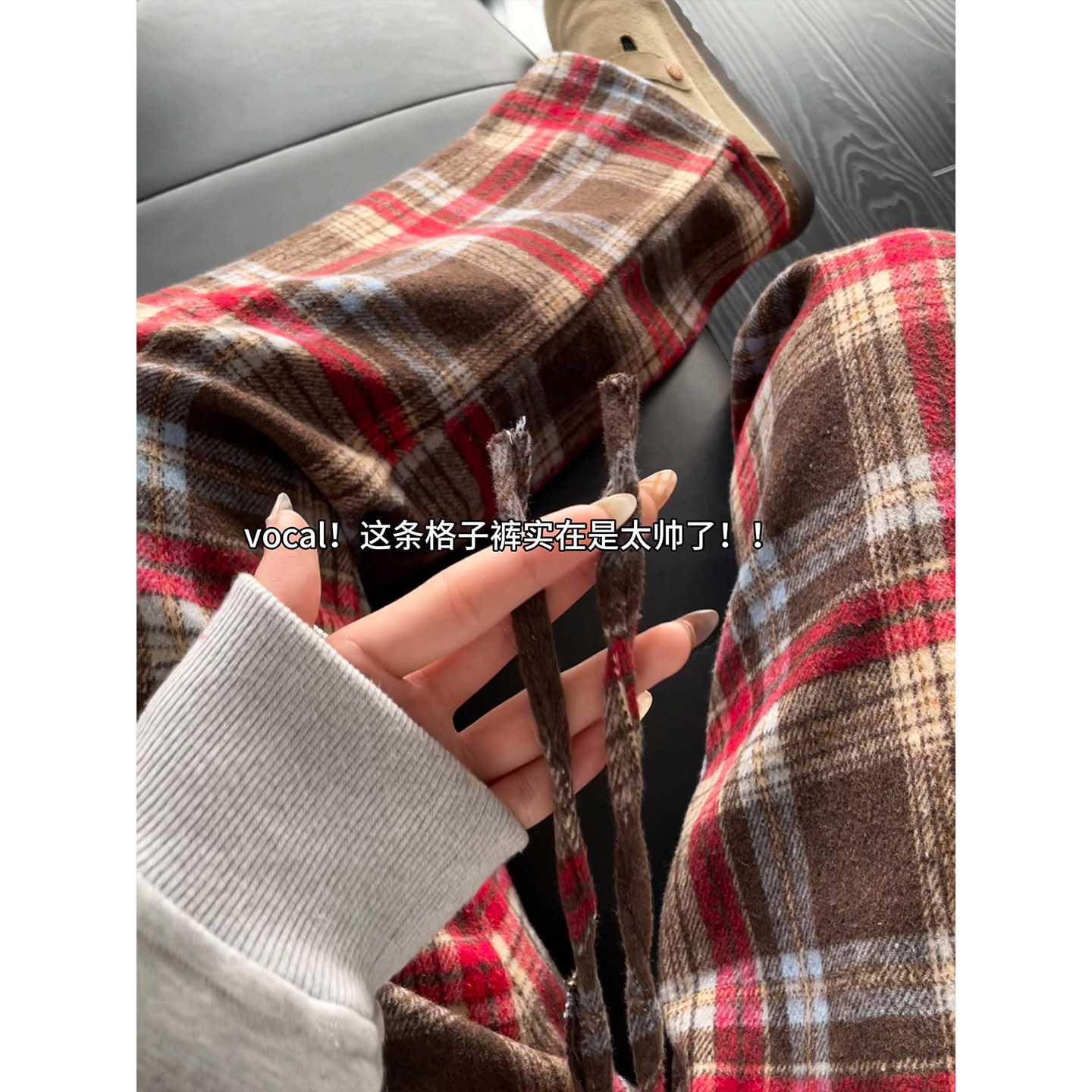 📚 红色毛呢格子加绒卫裤男款冬季美式重磅阔腿裤子加厚直筒休闲长裤