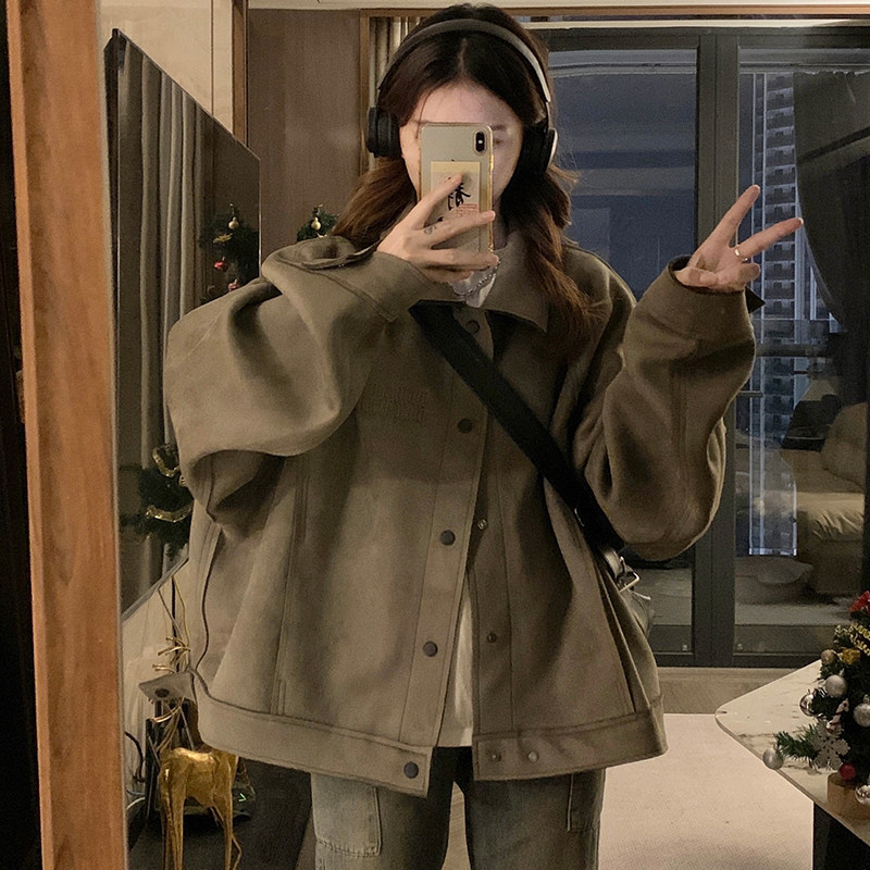 📚 实拍美拉蓝穿搭短款麂皮夹克美式复古机车外套hiphop男女情侣春季