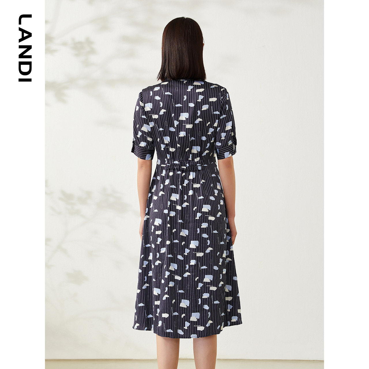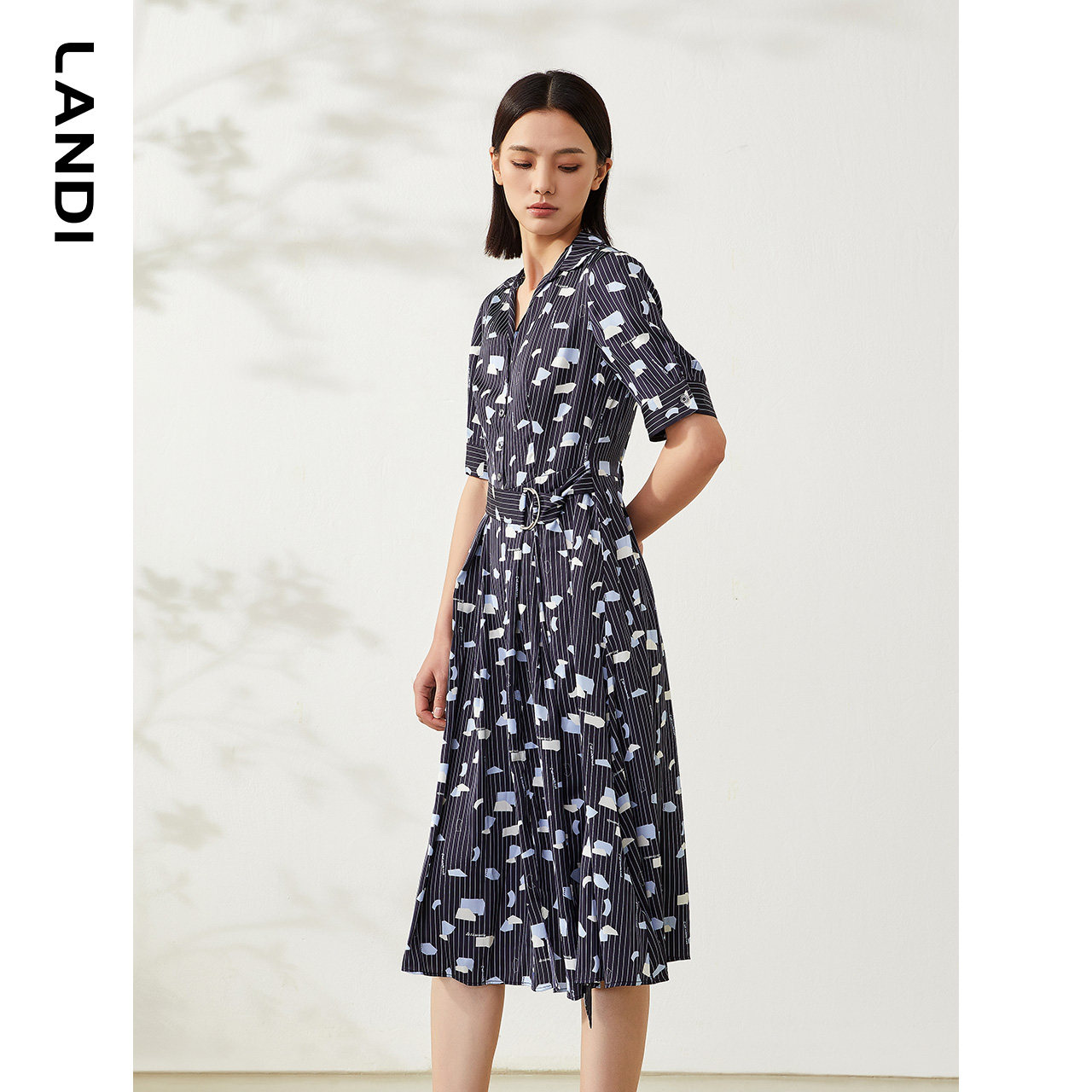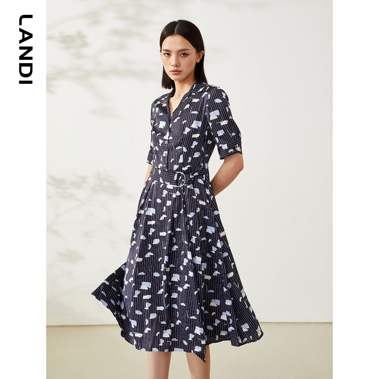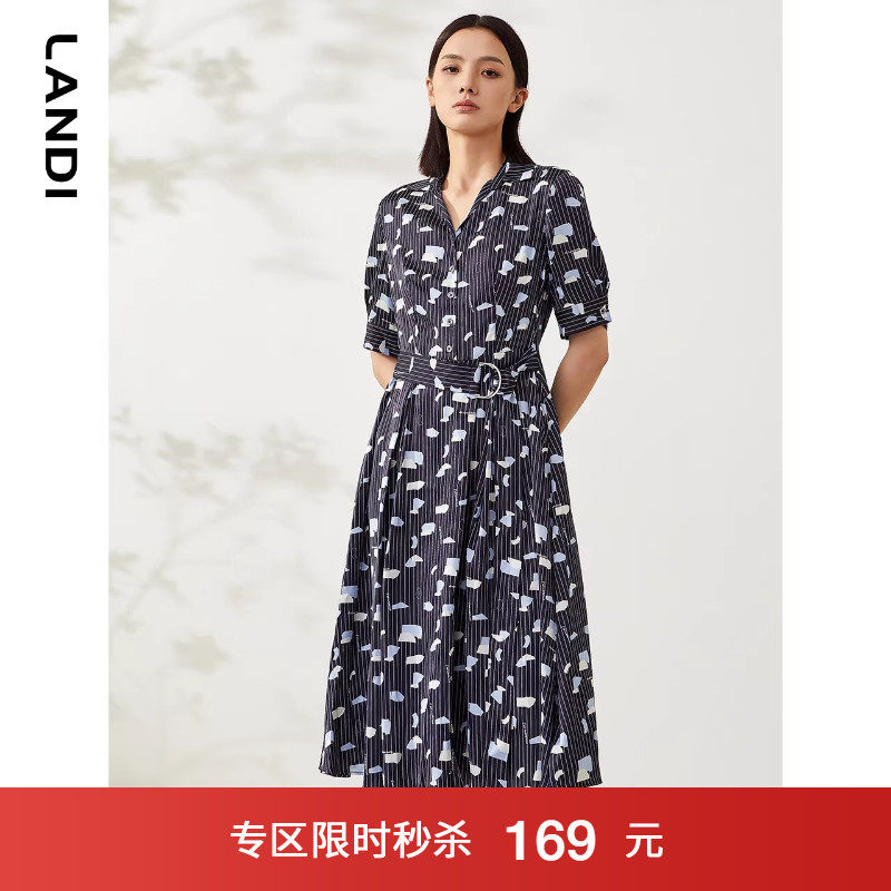 📚 LANDI秋季新款衬衫领条纹短袖印花腰带收腰连衣裙女裙
