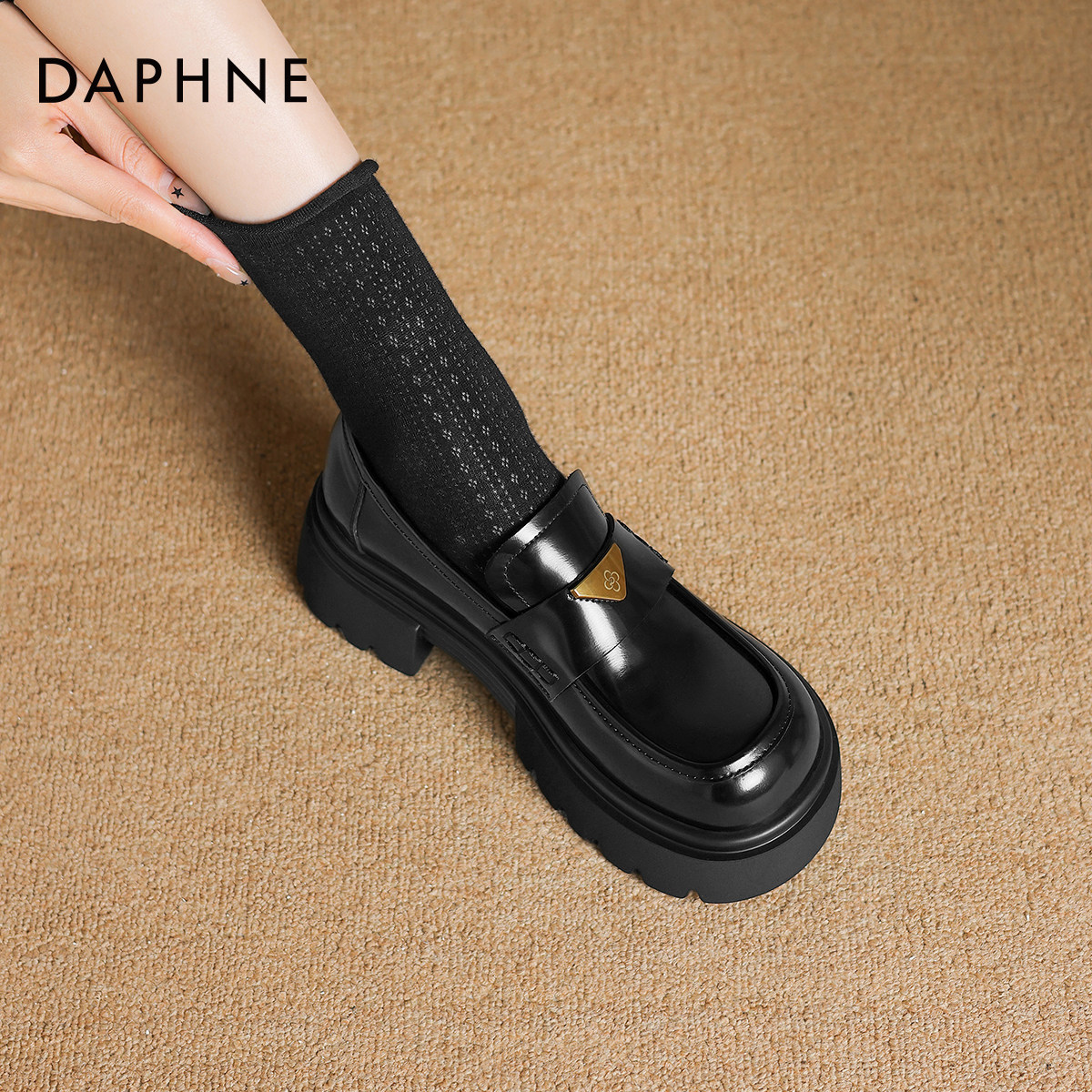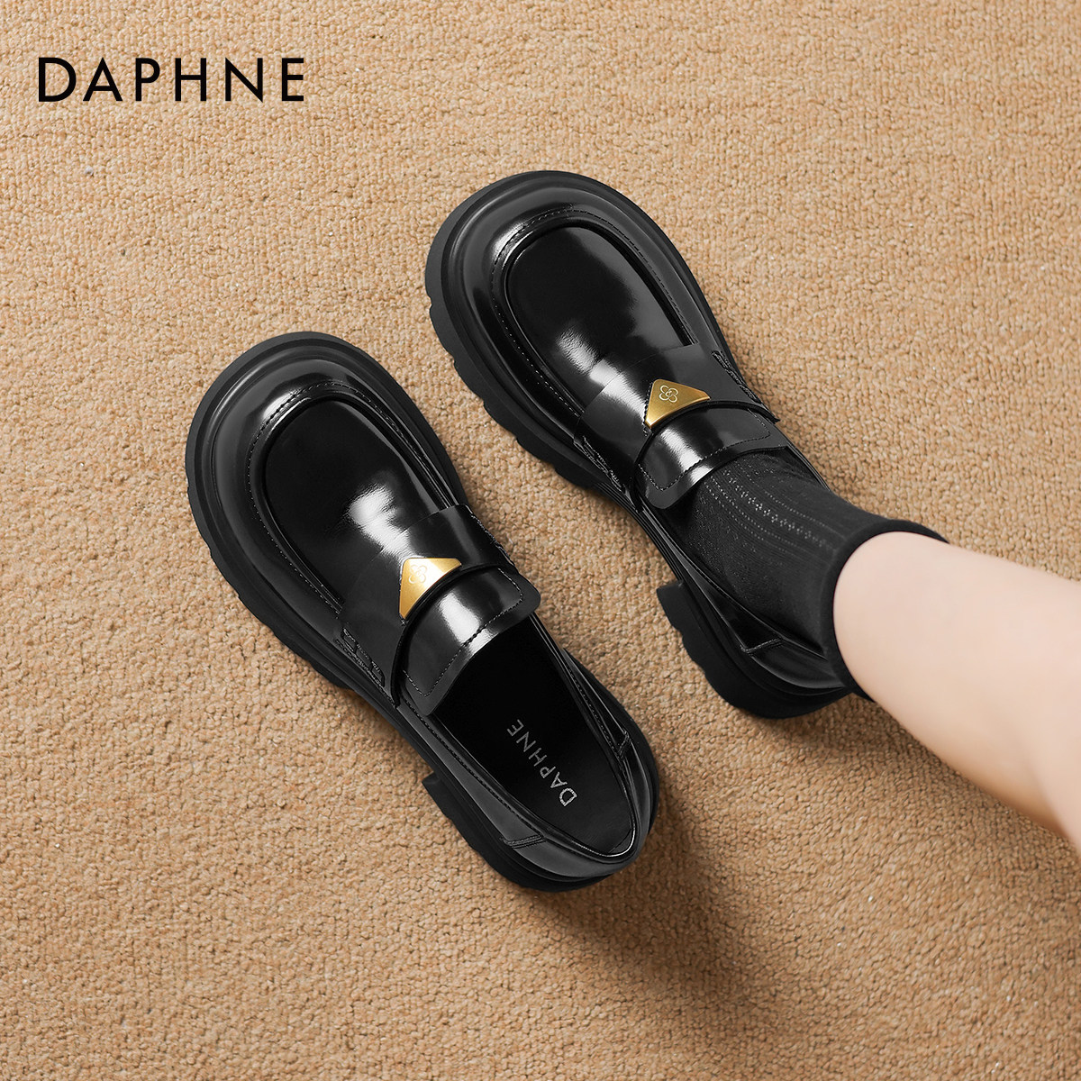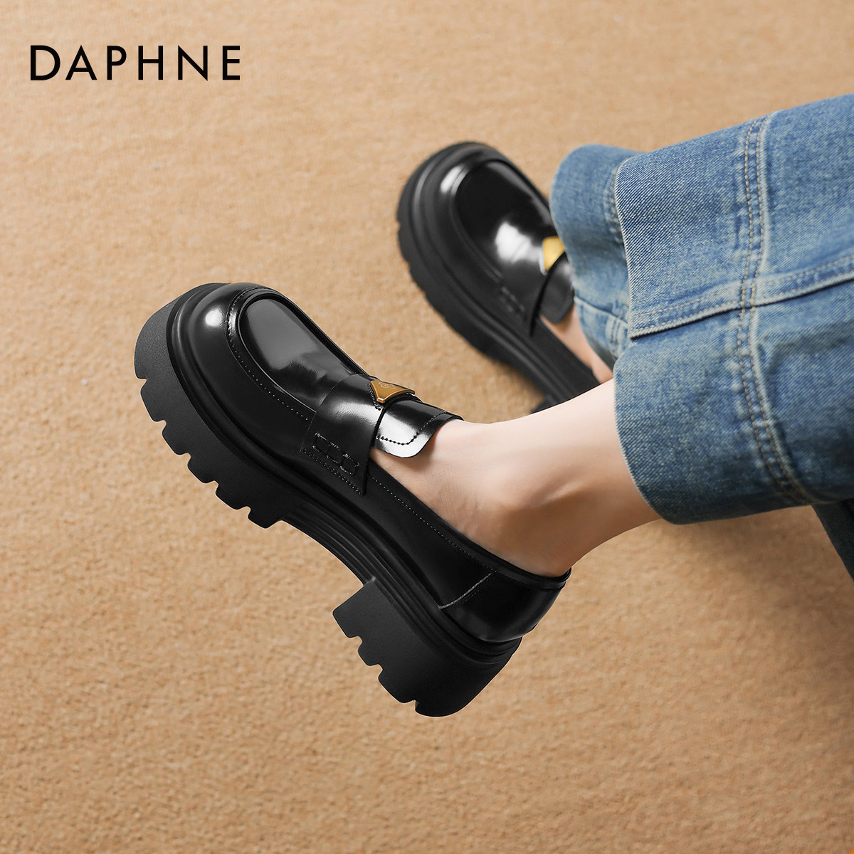 📚 达芙妮厚底乐福鞋女2026新款金扣英伦风小皮鞋女黑色通勤增高单鞋