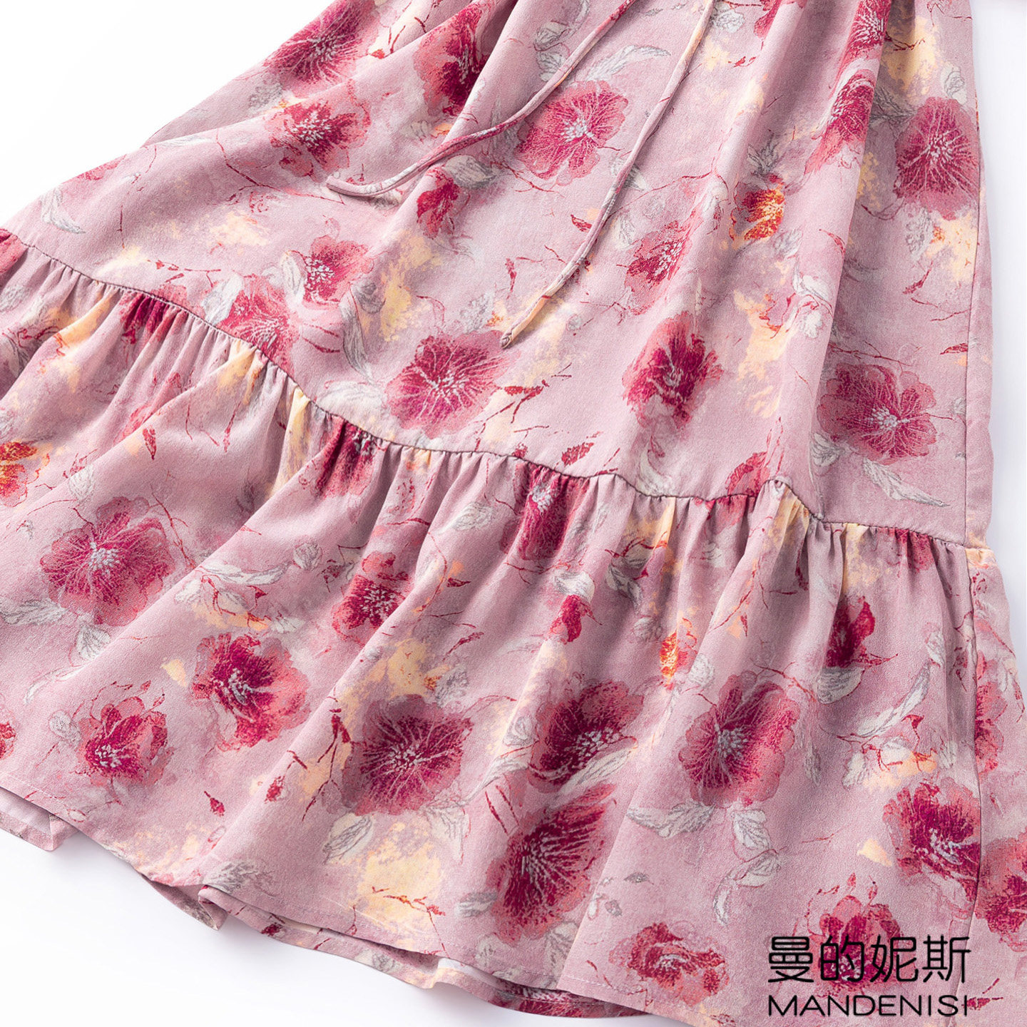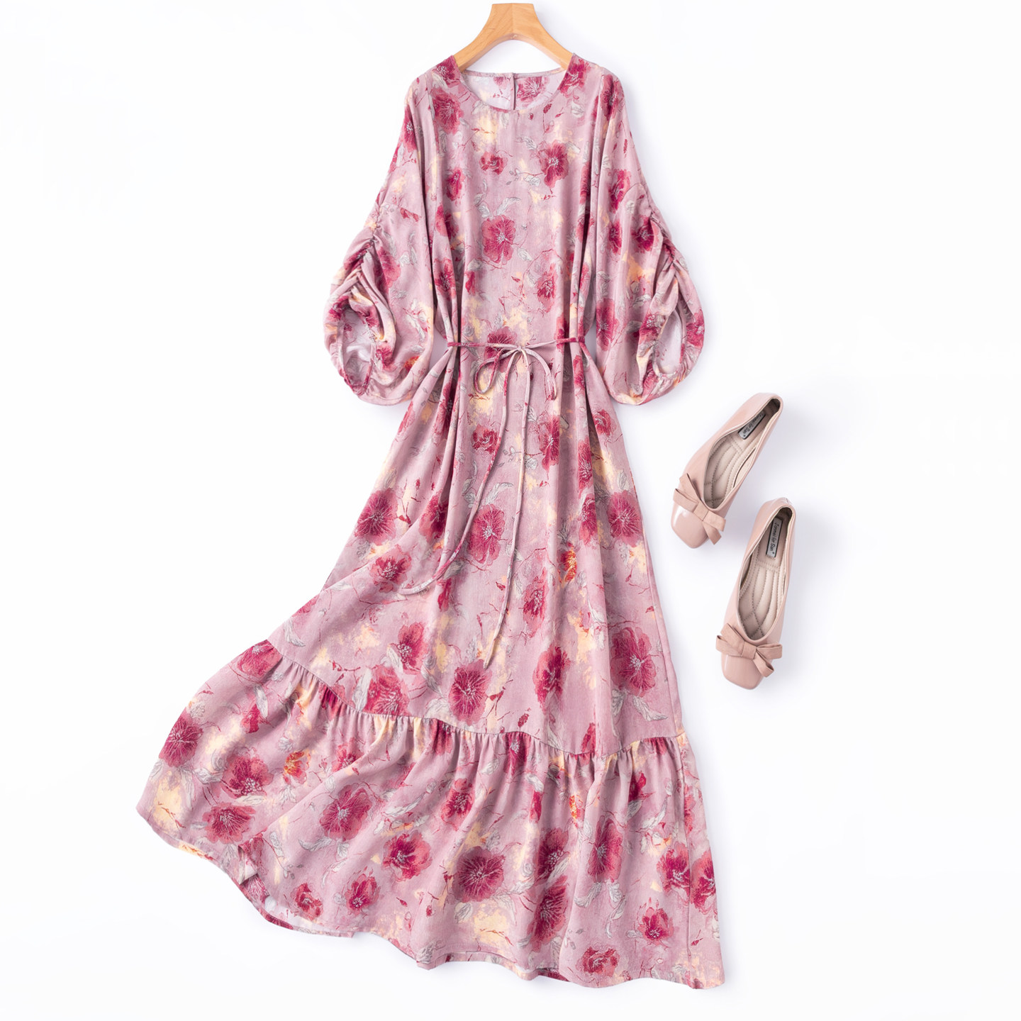 📚 “雾影玫瑰”浪漫温婉鱼尾桑蚕丝灯笼袖荷叶边大摆真丝度假连衣裙