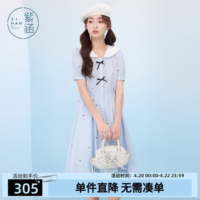 📚 紫涵撞色海军领连衣裙女夏季新款甜美减龄蓝色中长款a字裙航海系
