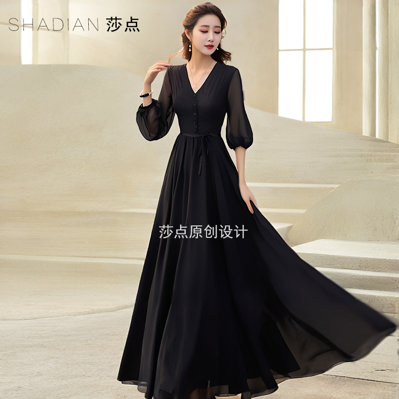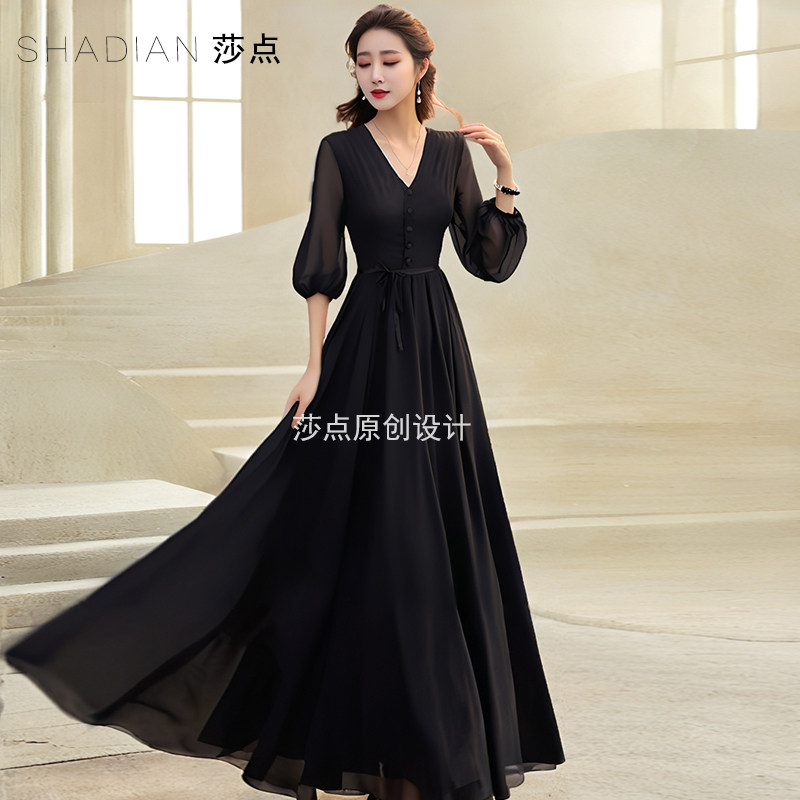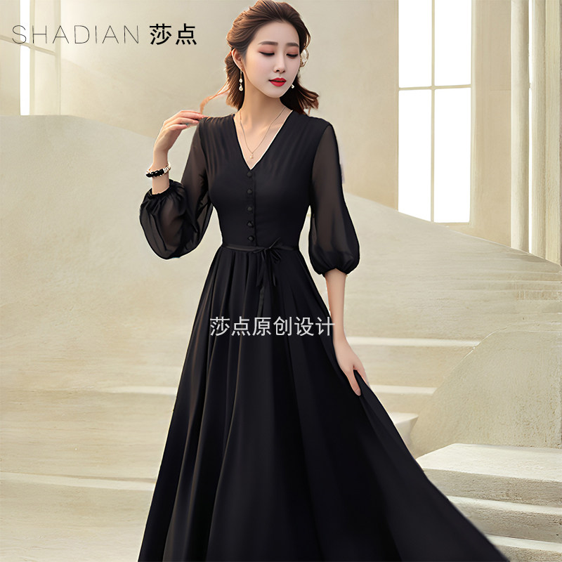 📚 黑色晚礼服高级感2025新款气质收腰显瘦赫本风小黑裙长款连衣裙