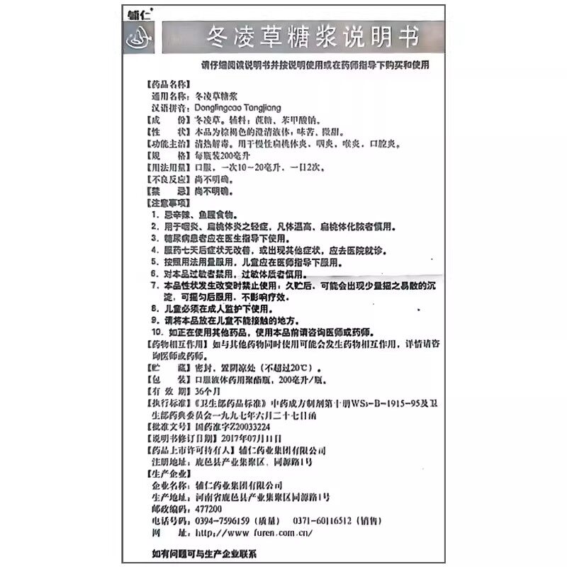 📚 辅仁 冬凌草糖浆200ml清热解毒用于慢性扁桃体炎咽炎喉炎口腔炎