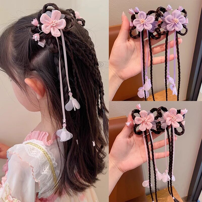 📚 古风假发辫子发饰小女孩可爱花朵发卡儿童汉服头饰中国风女童发夹