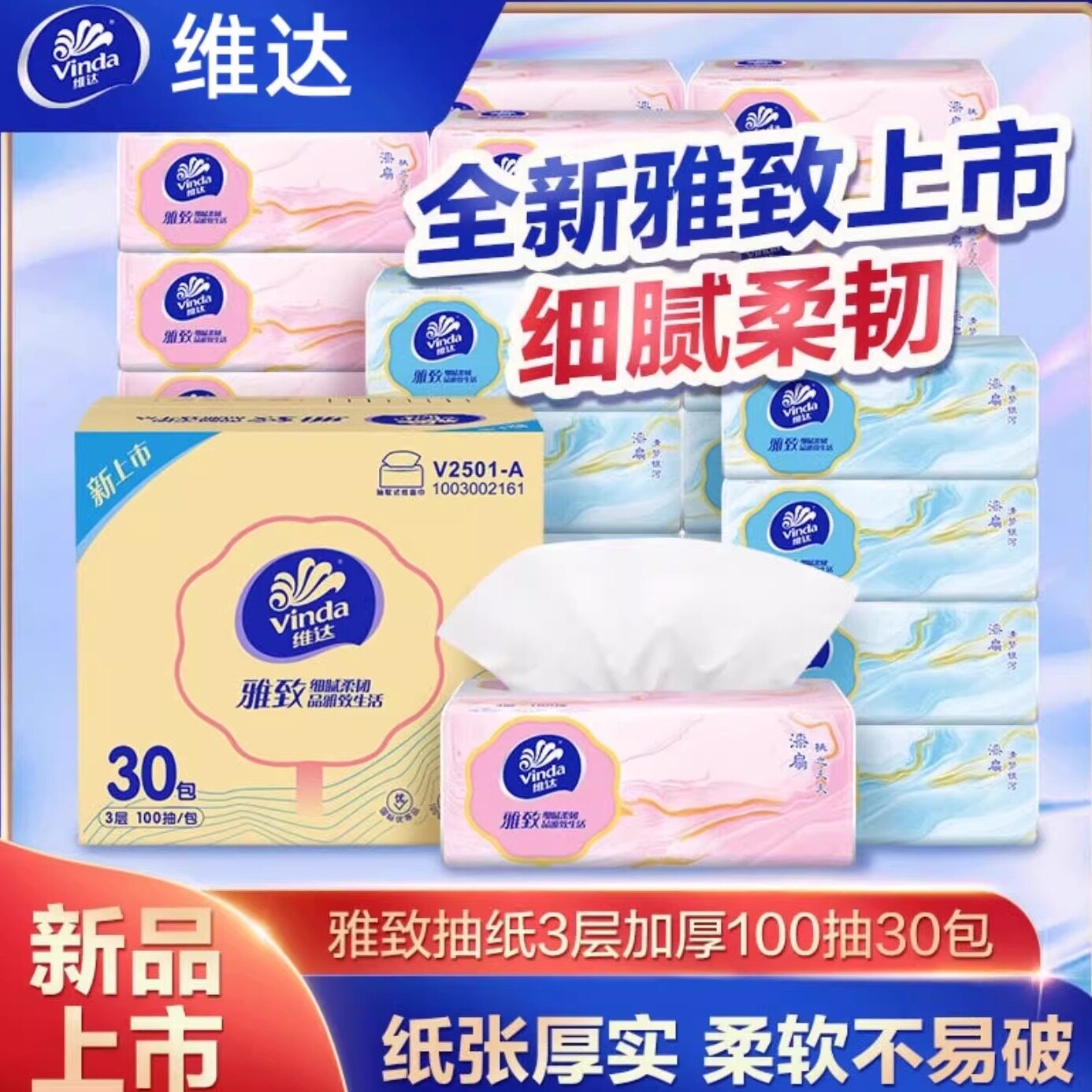 📚 维达雅致漆扇抽纸30包3层加厚100抽细韧柔软面巾纸整箱纸巾面巾纸