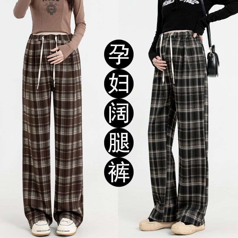 📚 孕妇裤子春秋款外穿无托腹格子阔腿裤秋冬天小个子大码打底裤春装