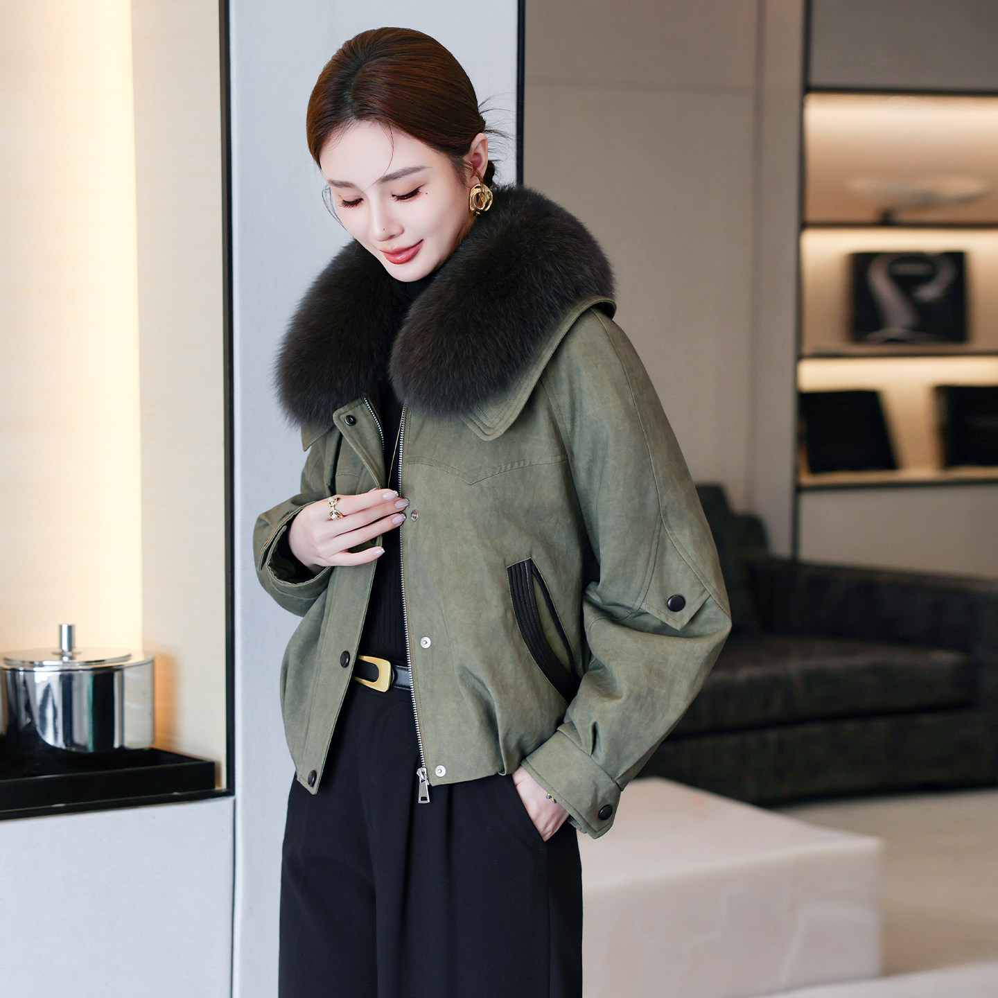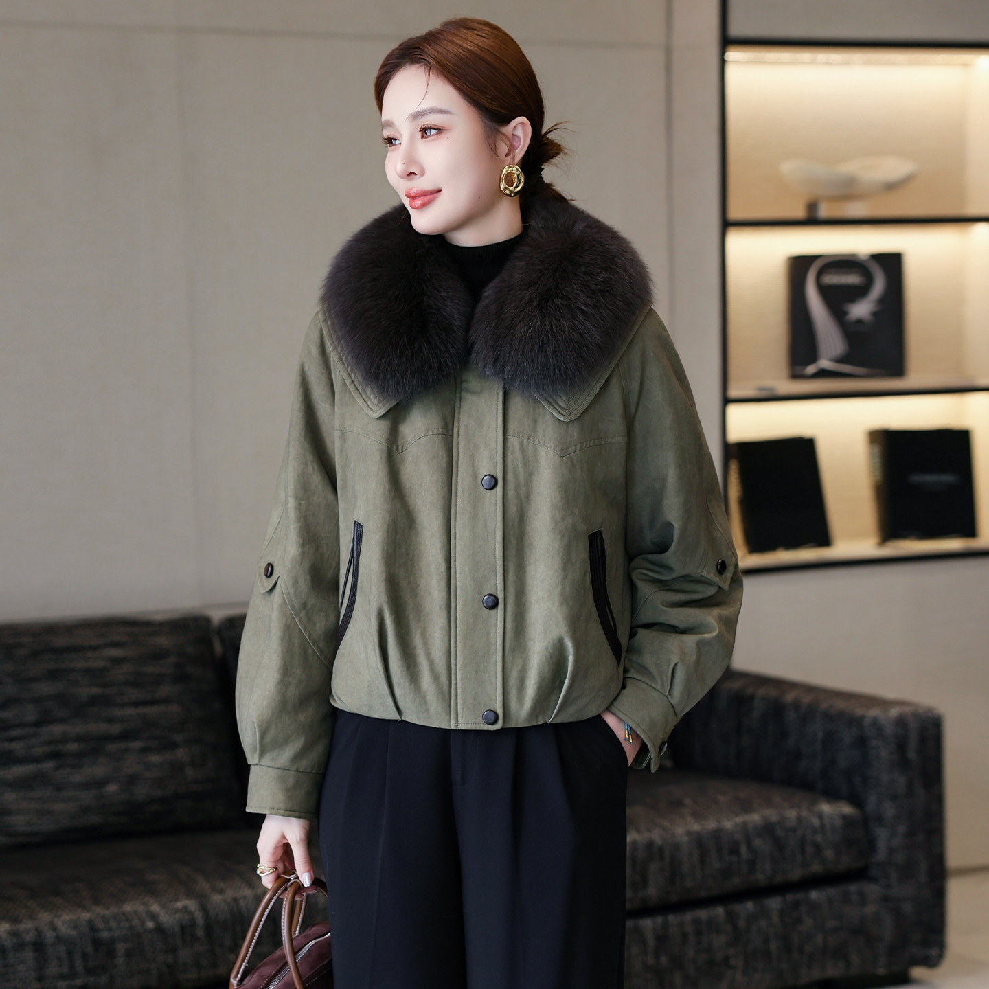 鹅绒毛领短款皮草羽绒服