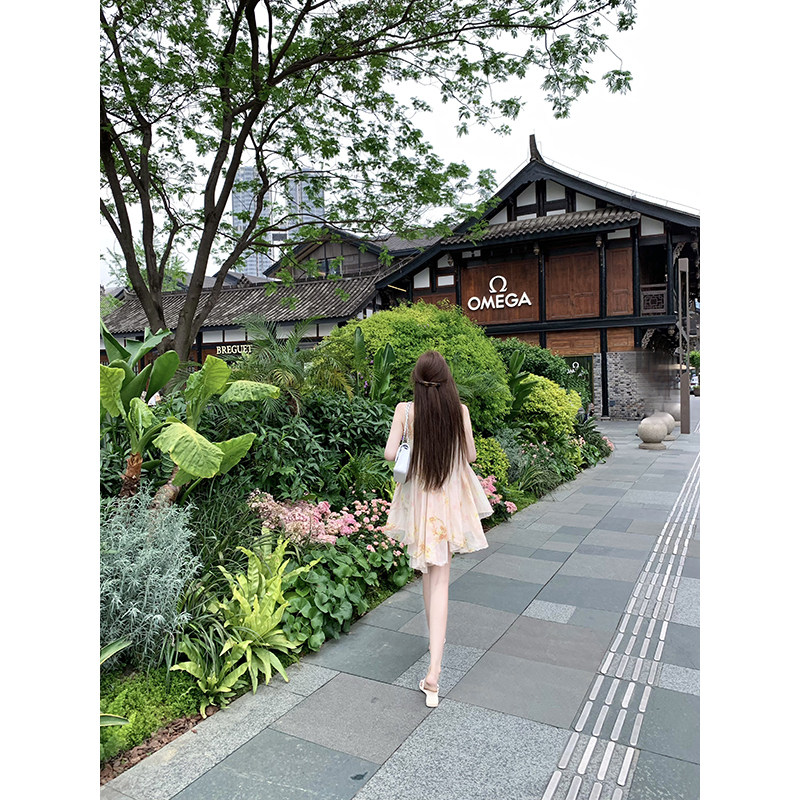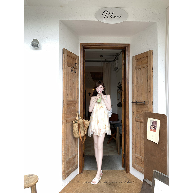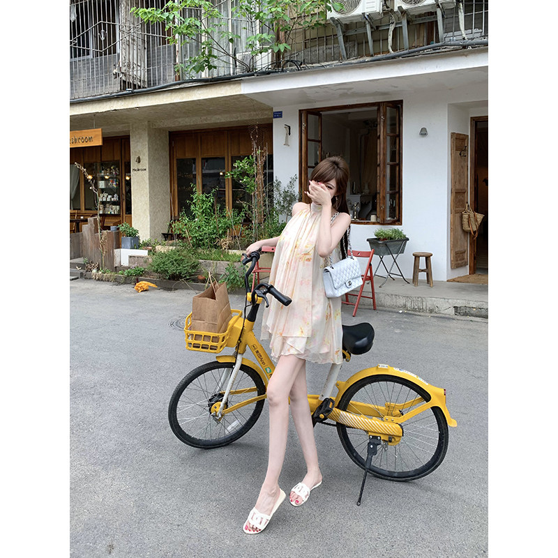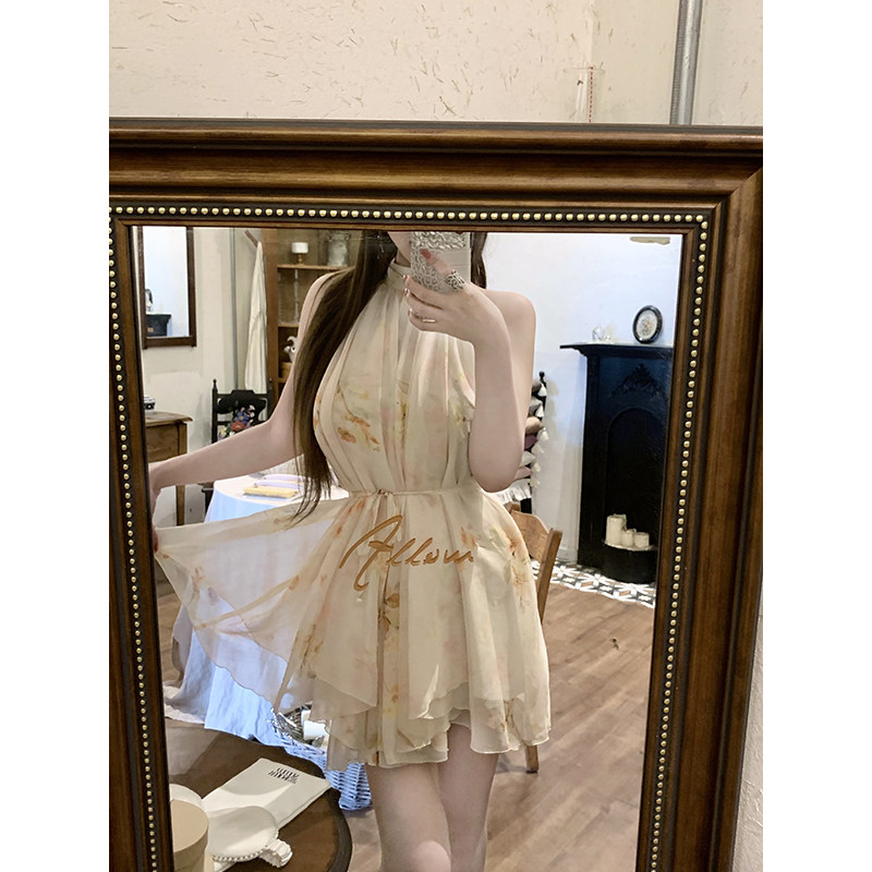 📚 With 99jiu【风吟花事】气质碎花挂脖无袖连衣裙温柔短款度假裙