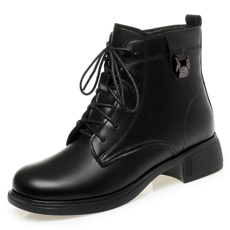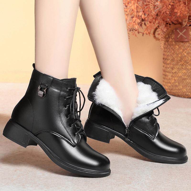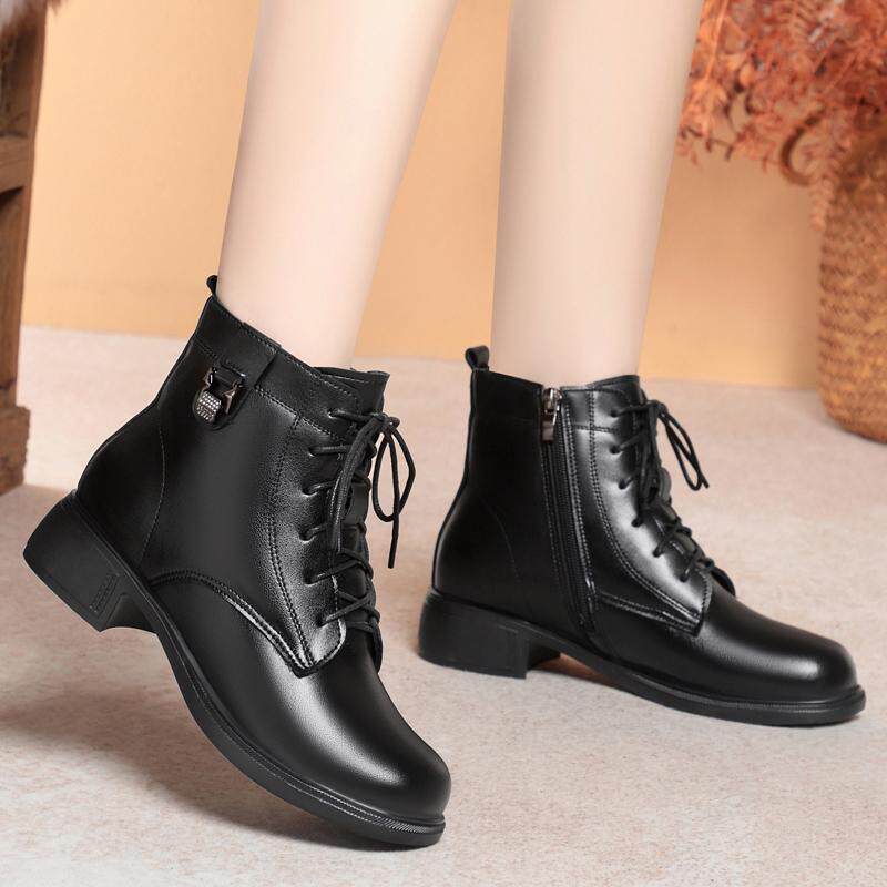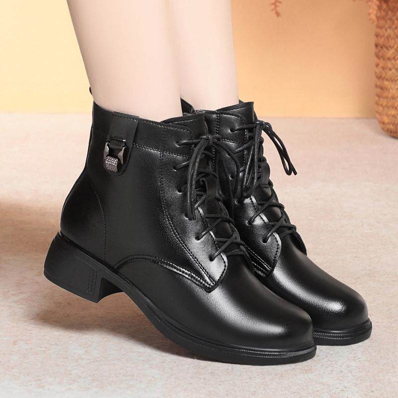 📚 加绒绑带英伦风小皮鞋冬季中年软底妈妈鞋真皮靴子粗跟马丁靴软底