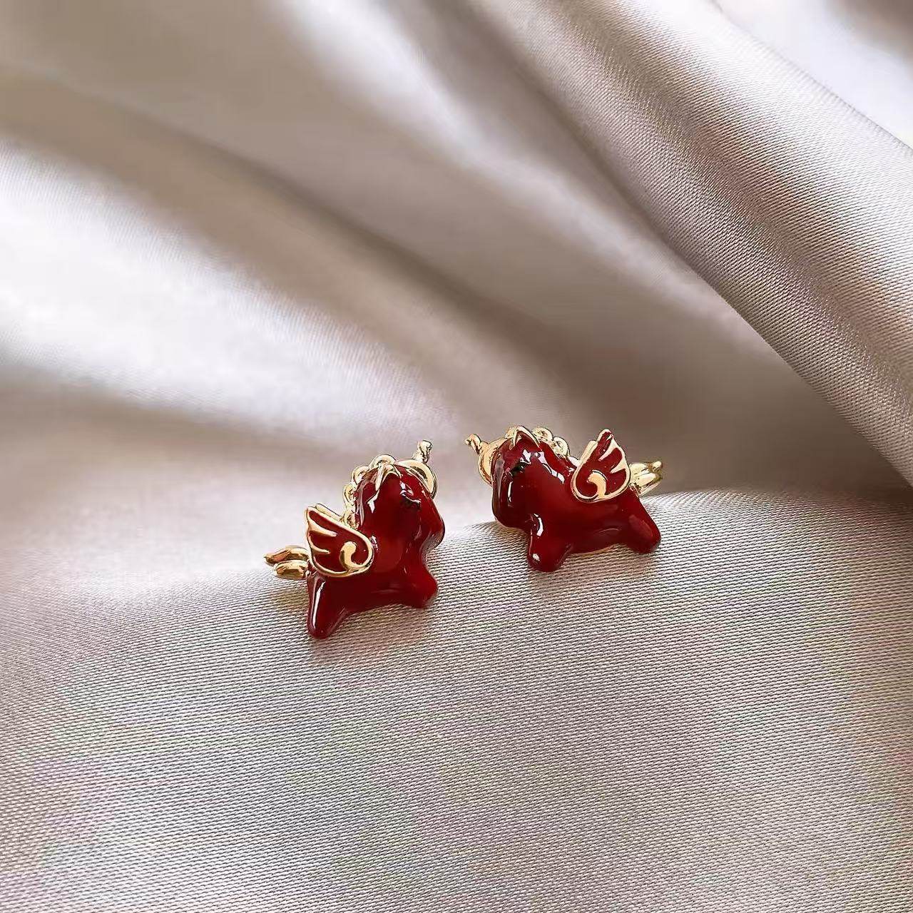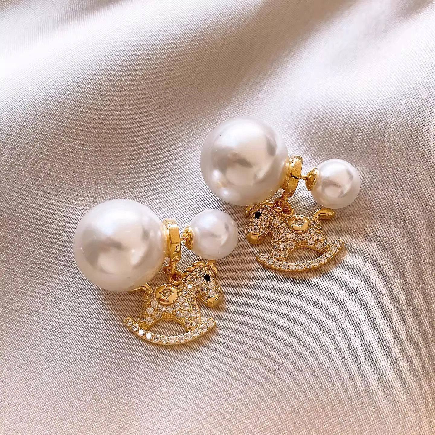 📚 金色小马珍珠长款耳坠耳环女2026新款爆款耳钉不对称马年耳饰过年