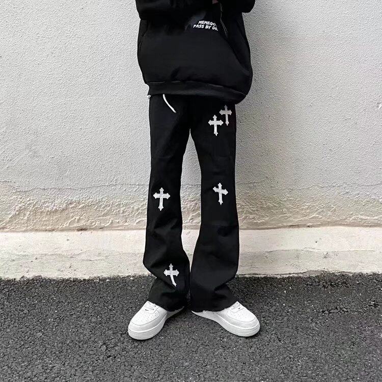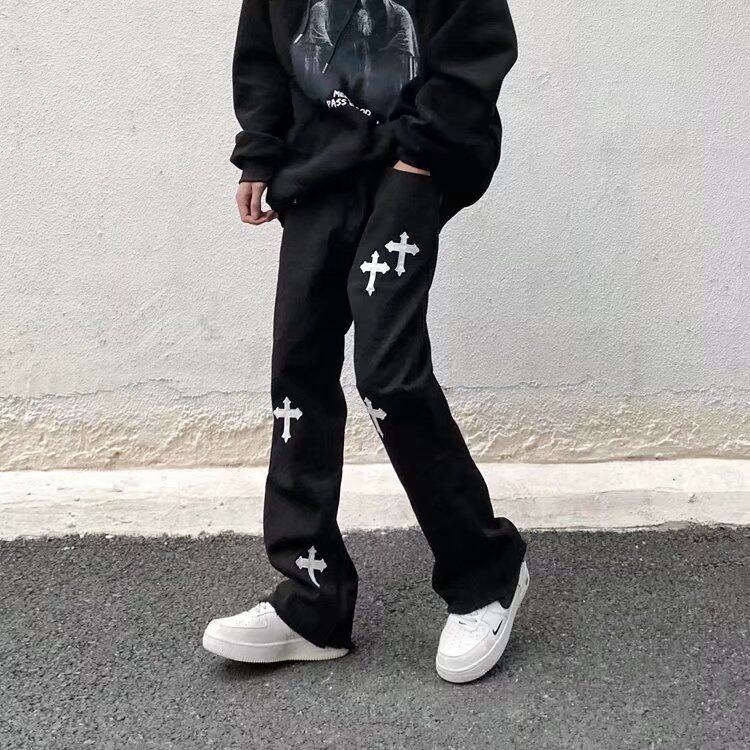 📚 非潮勿近高街美式vibe风微喇十字架宽松牛仔裤潮牌嘻哈炸街裤子男