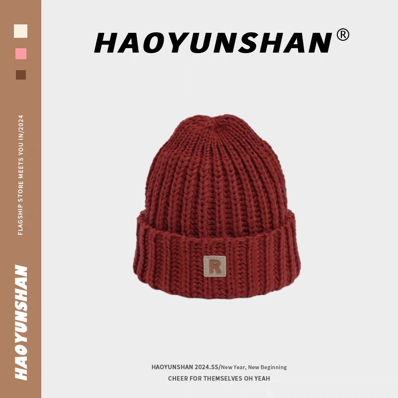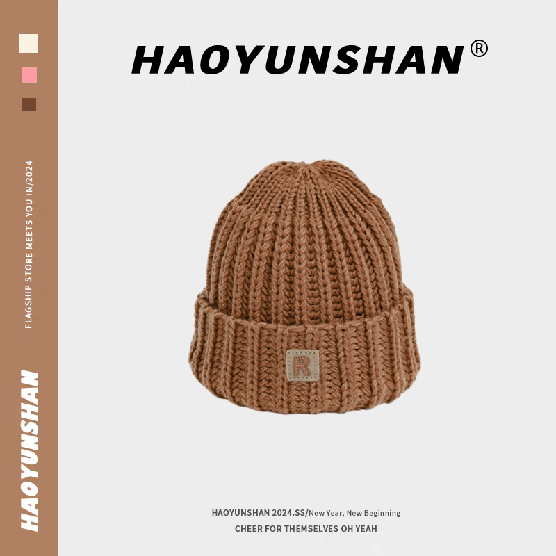 📚 秋冬新款R标毛线帽男女街头宽松版套头冷帽韩版百搭卡其色针织帽