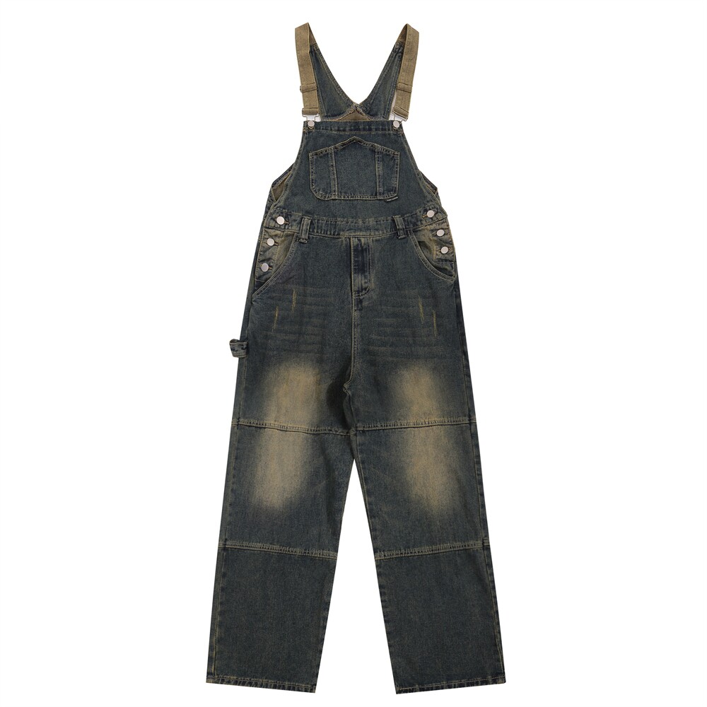 📚 美式街头重磅做旧水洗工装牛仔背带裤男女宽松连体工装阔腿直筒裤