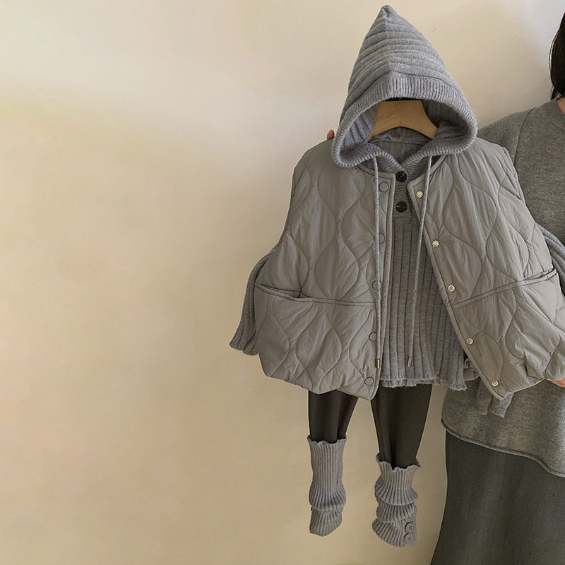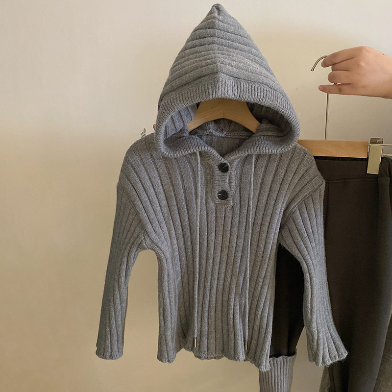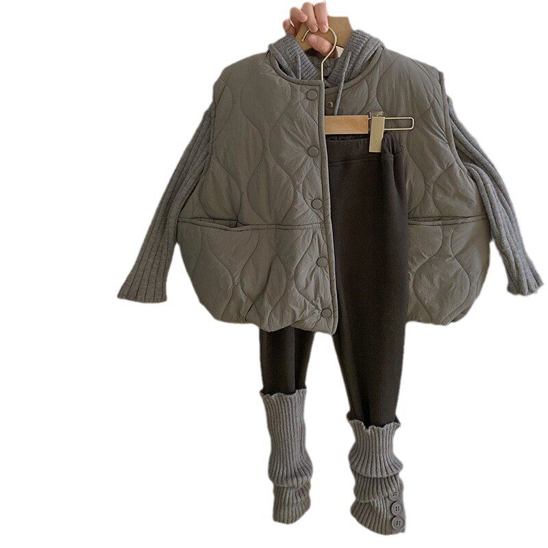 📚 女童韩版连帽针织毛衣保暖夹棉马甲2024秋冬新款加绒打底裤套装潮