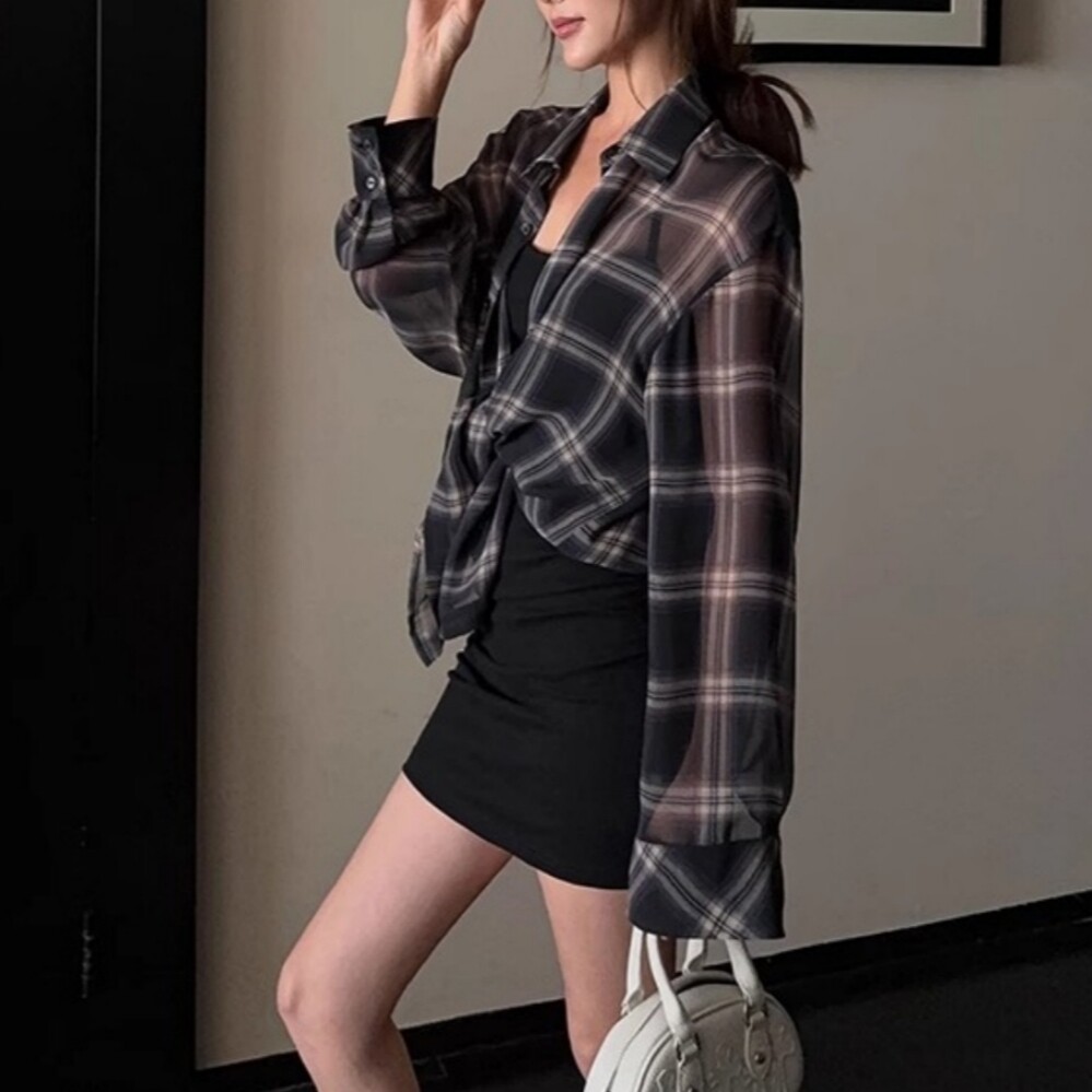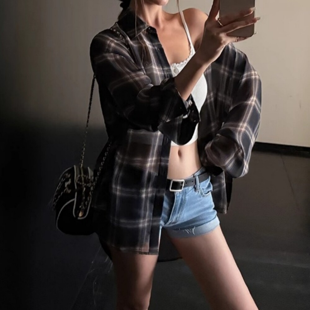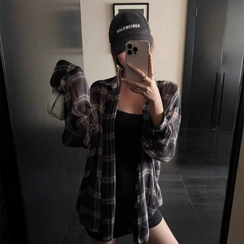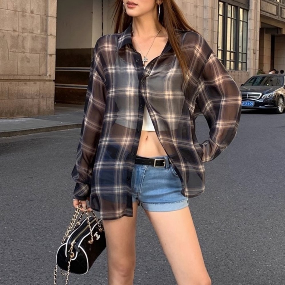 📚 美式复古宽松格子长袖薄衬衫女春秋外搭夏季雪纺防晒外套休闲上衣
