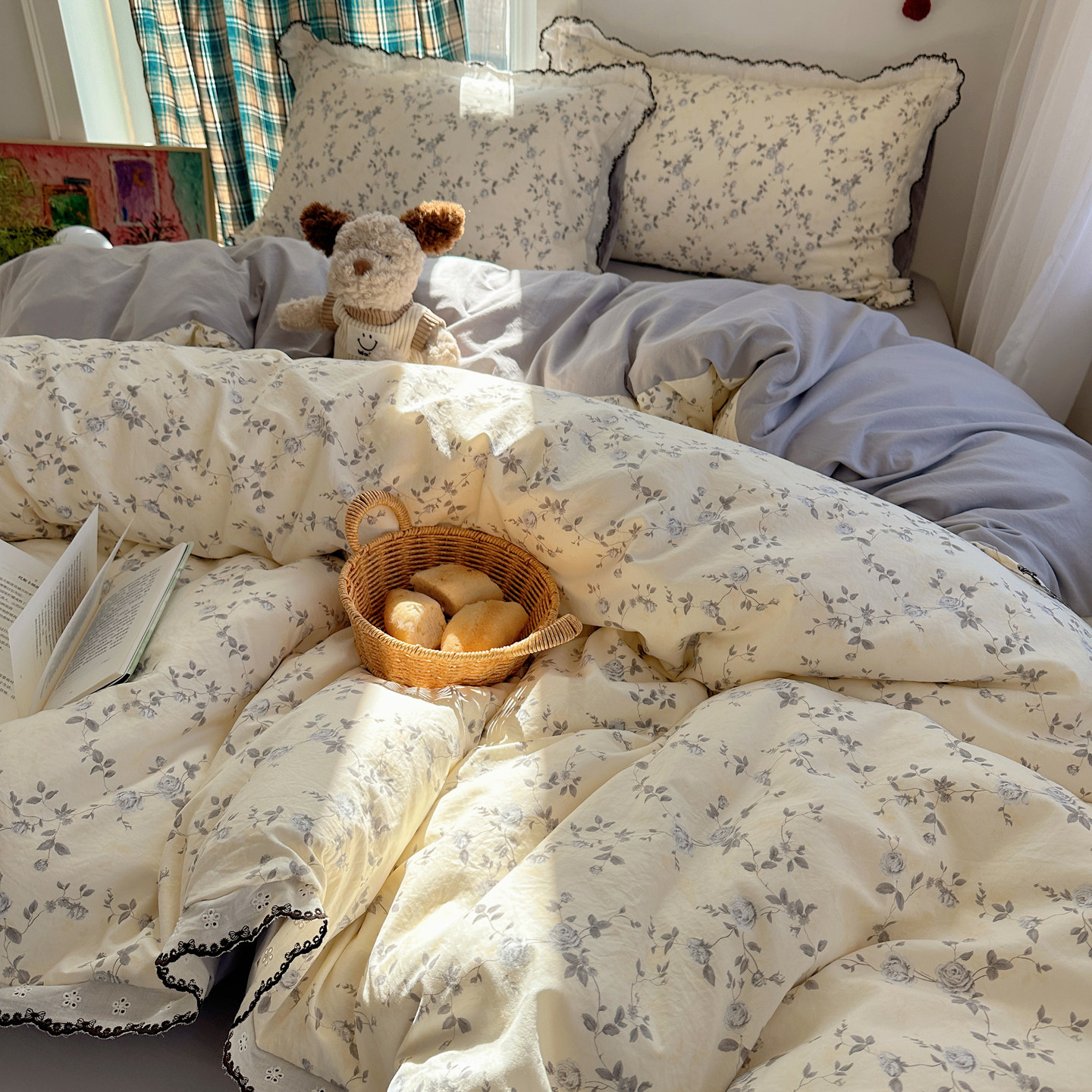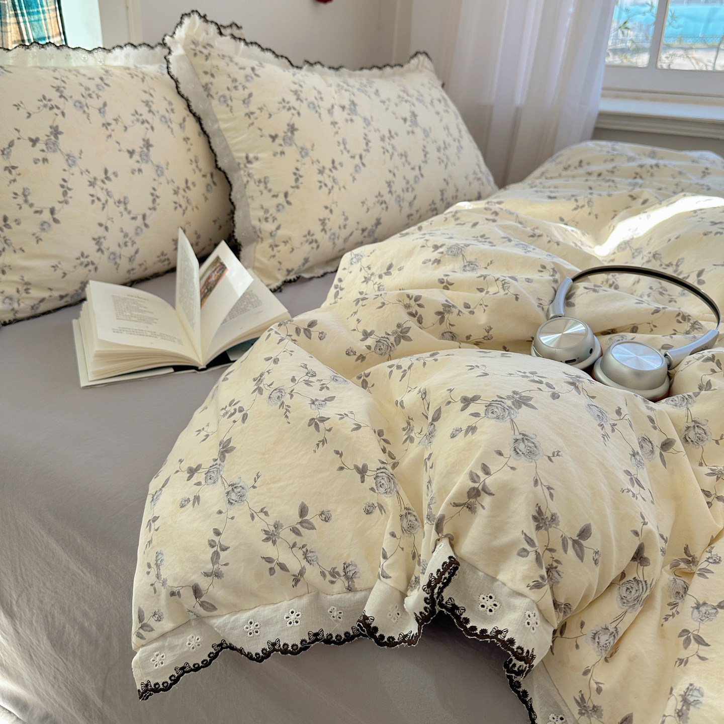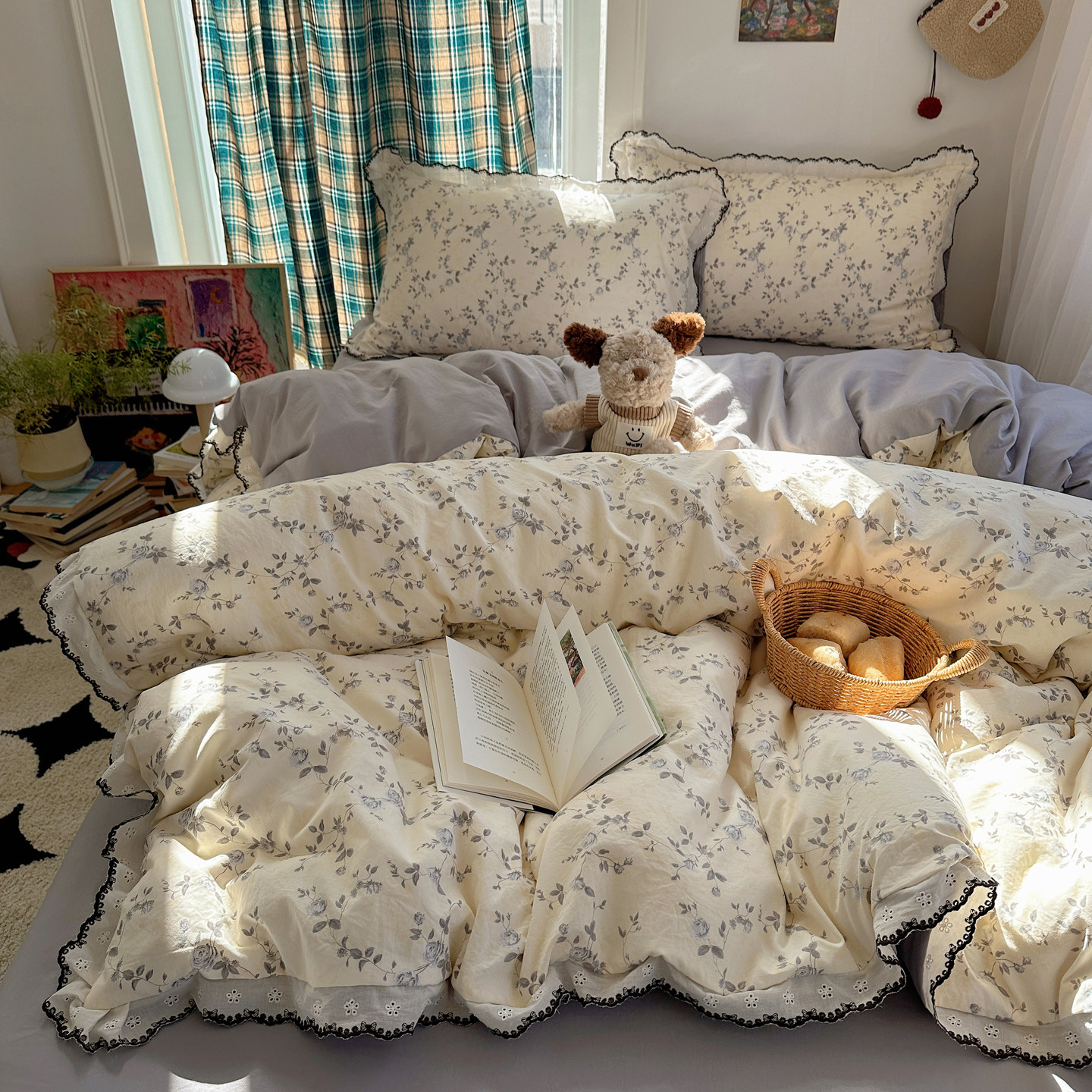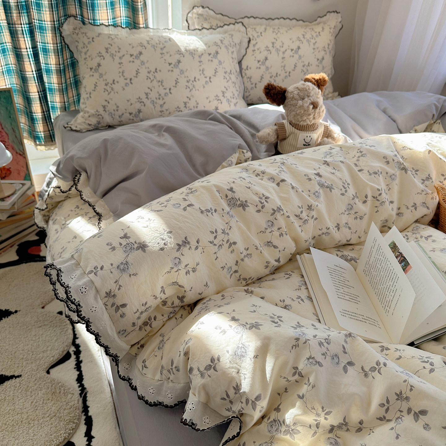 📚 A类法式碎花床上四件套纯棉全棉花边被套床单床笠学生宿舍三件套