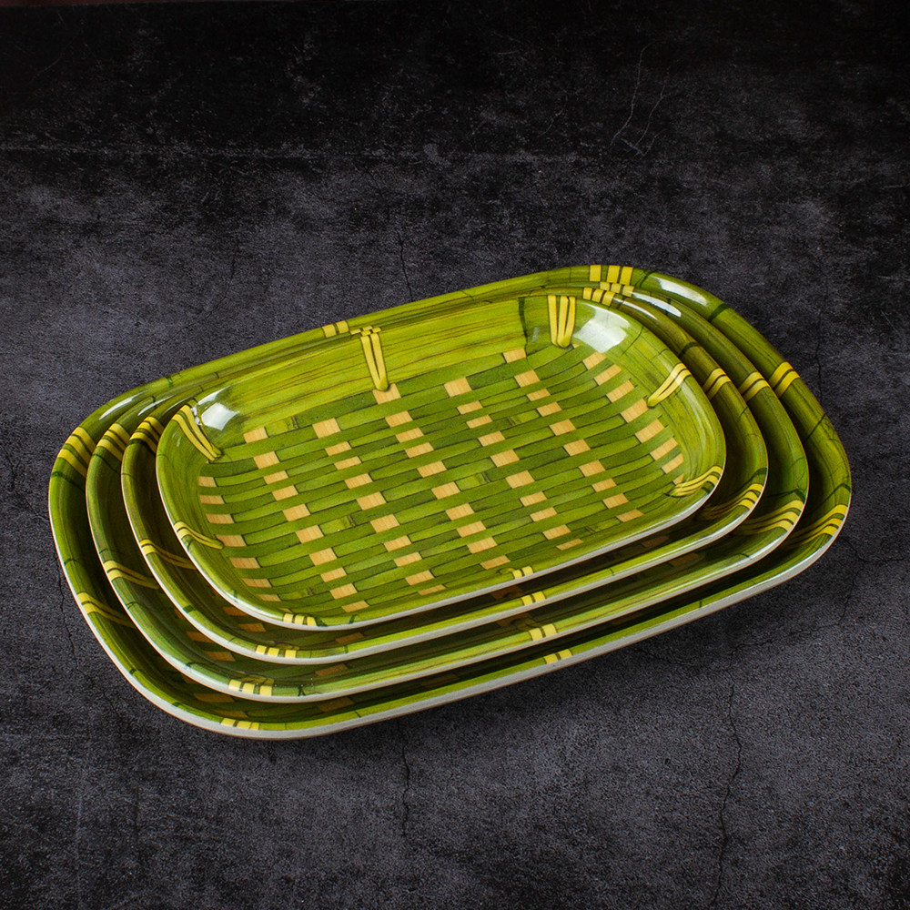 📚 绿竹编肠粉盘子烧烤专用碟子长方形塑料盘商用火锅店密胺仿瓷餐具