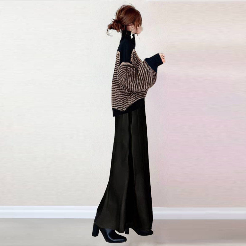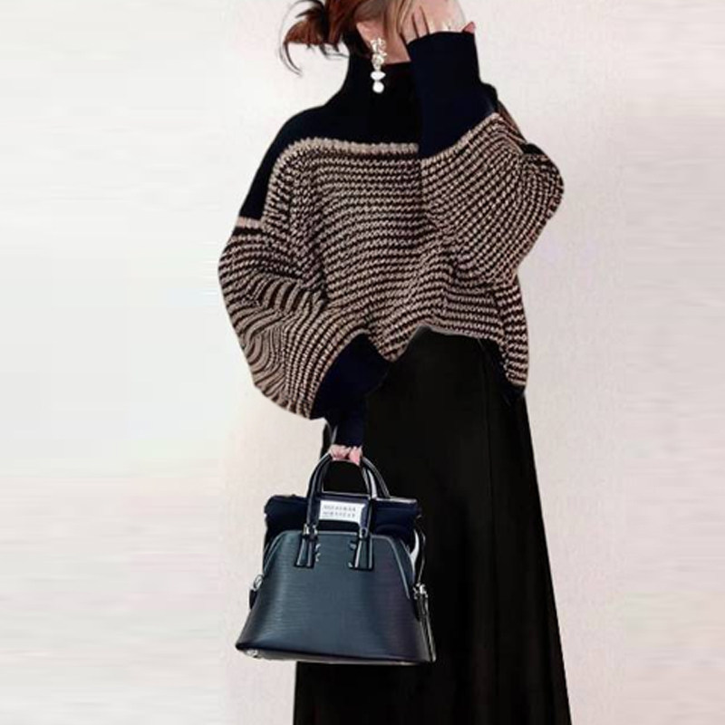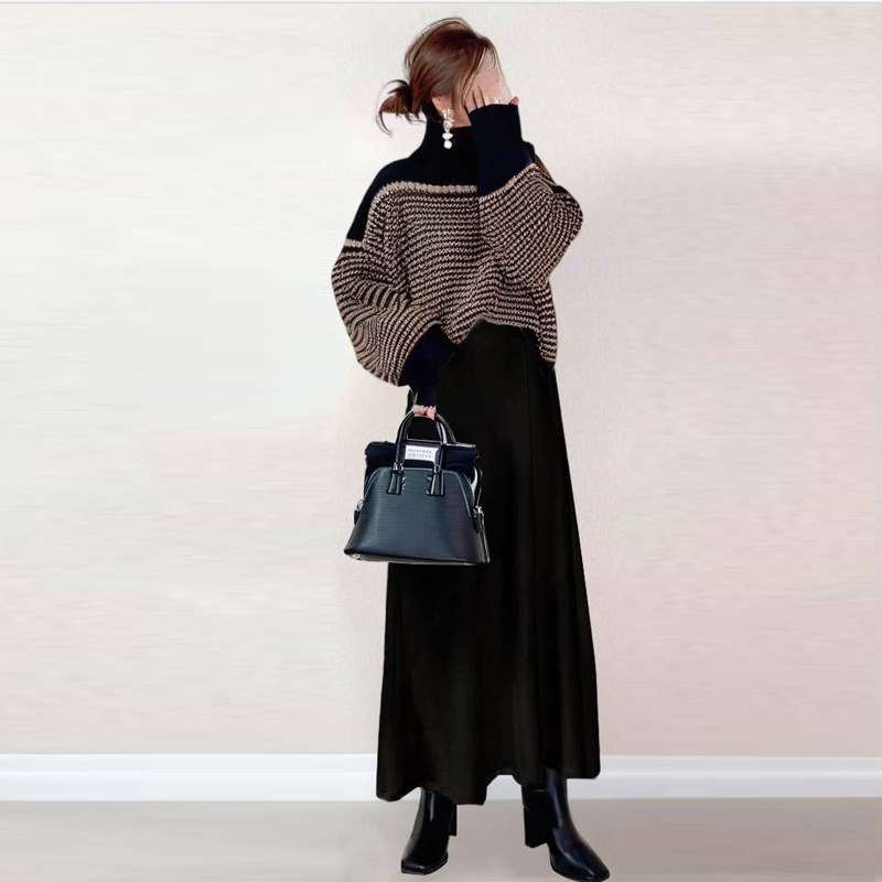 📚 秋冬女装外贸日系2024新款高领条纹针织上衣+半裙 两件套