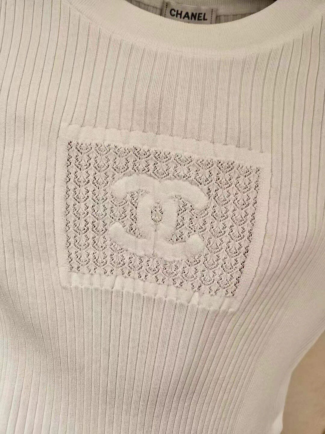 📚 Chanel香奈儿24C新款女装白色方块镂空双C针织短袖修身T恤上衣