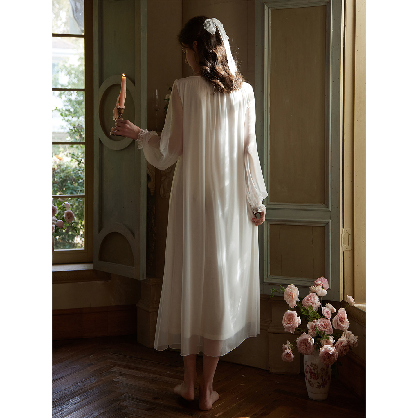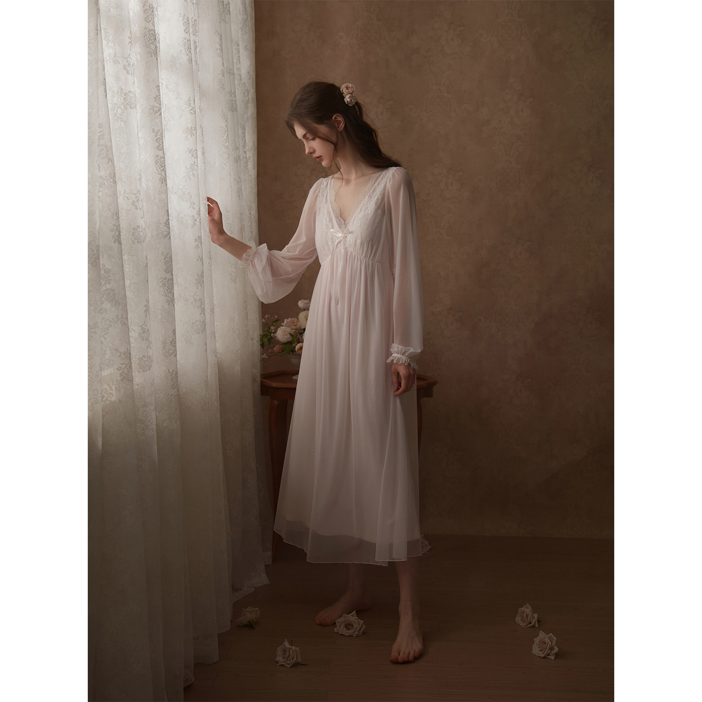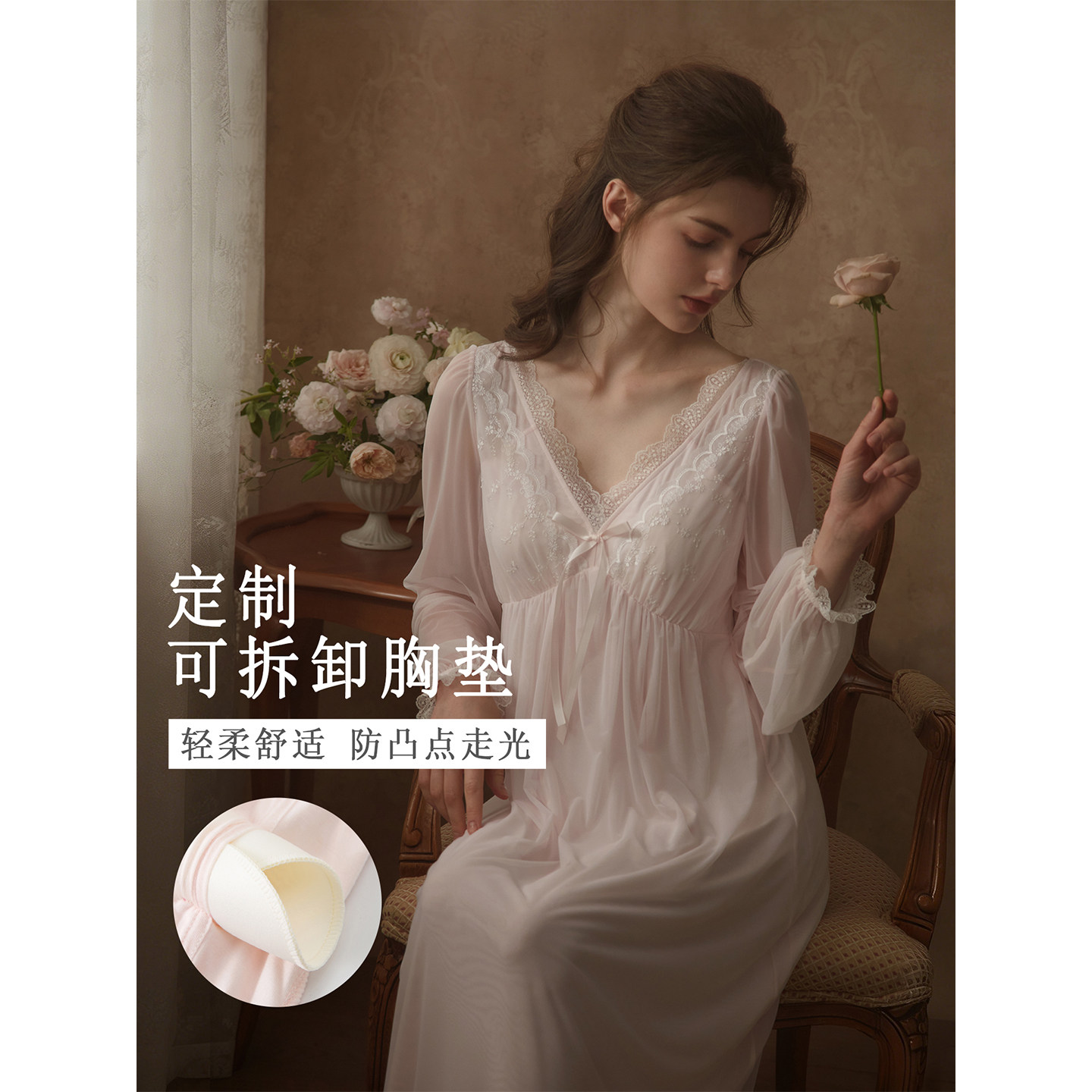 📚 RoseTree宫廷风睡裙女春秋长袖长款蕾丝高级感法式绝美睡衣带胸垫