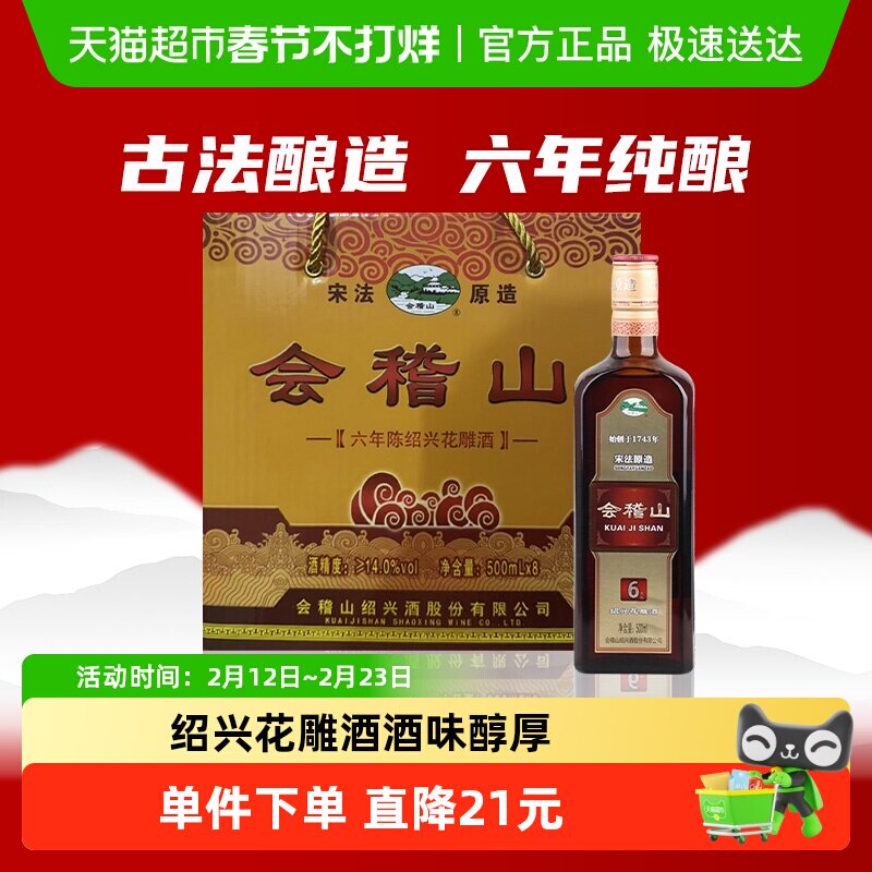 📚 绍兴黄酒 会稽山纯正宋法六年陈酿整箱花雕酒正品500ml*8瓶