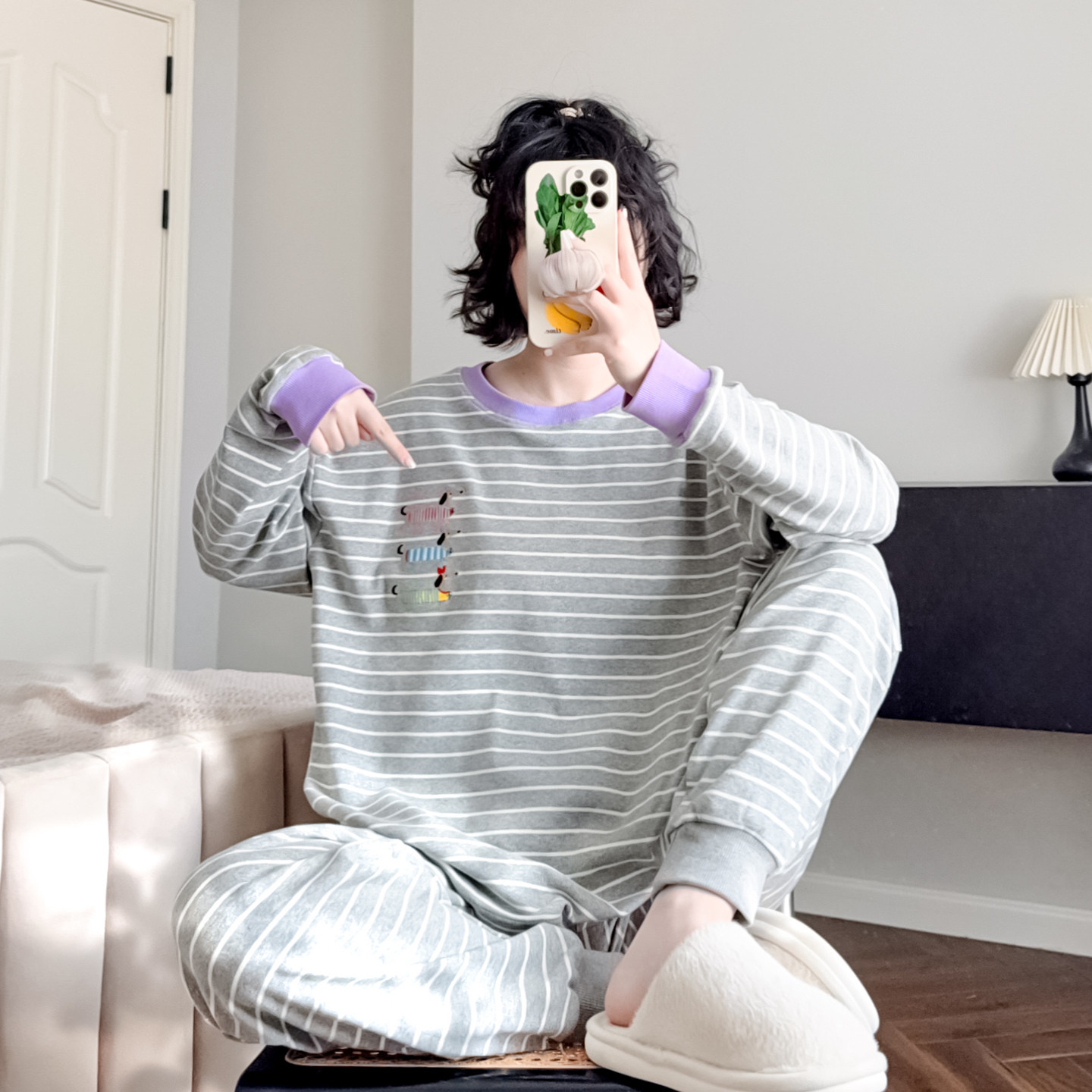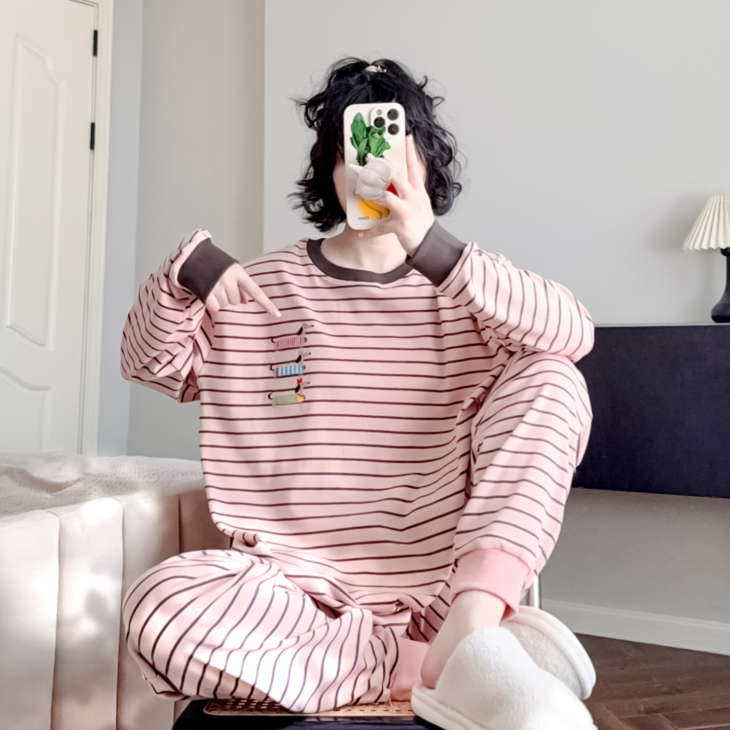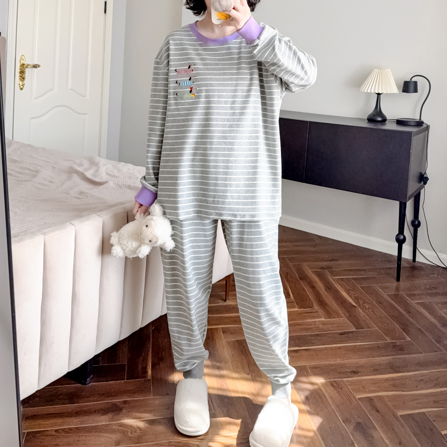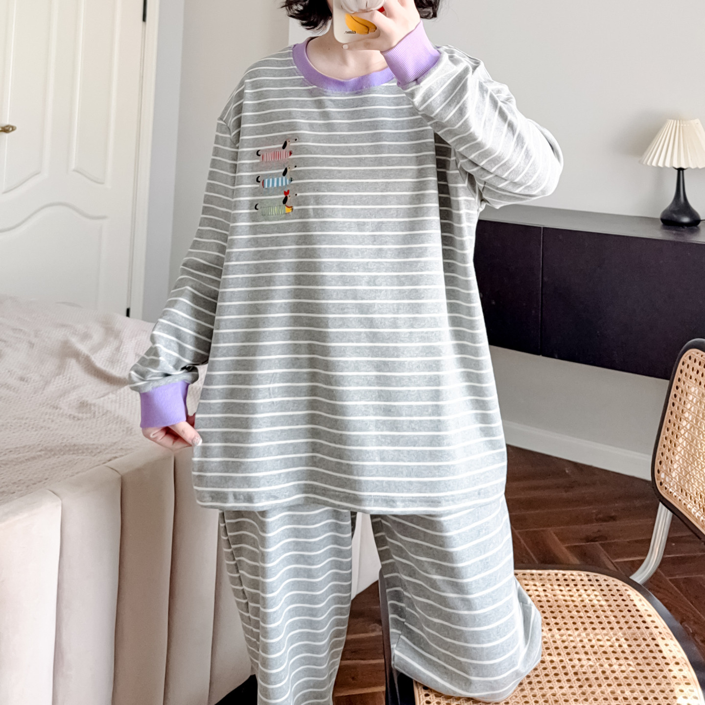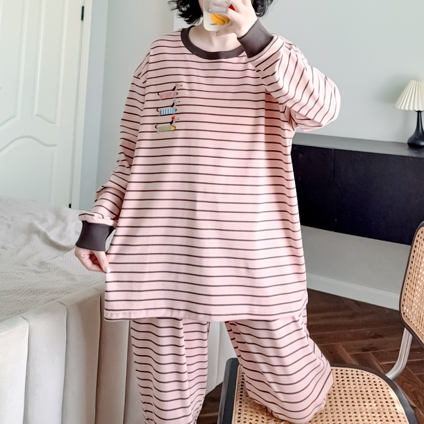📚 简约条纹睡衣女纯棉春秋束脚裤可爱卡通宽松休闲可外穿家居服套装