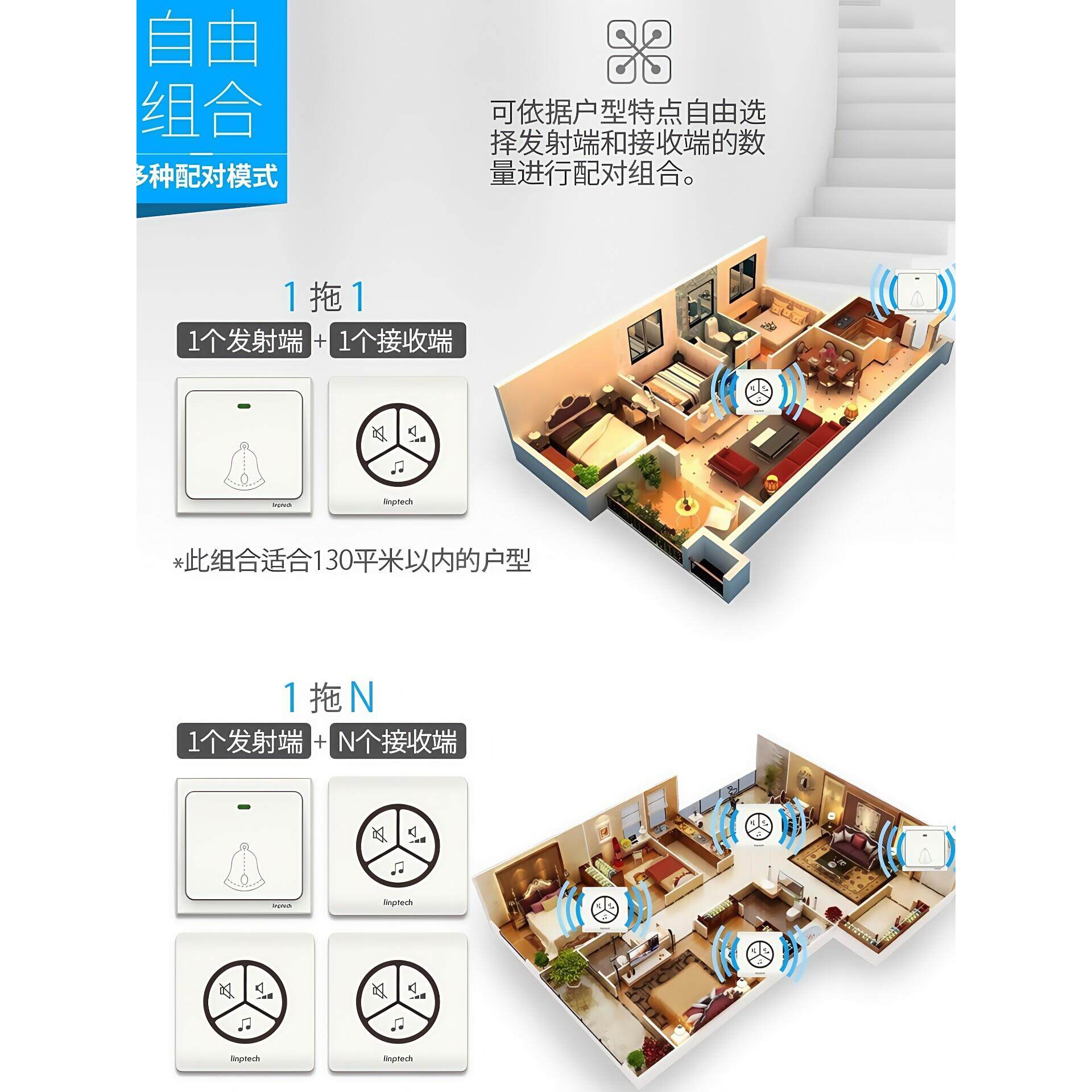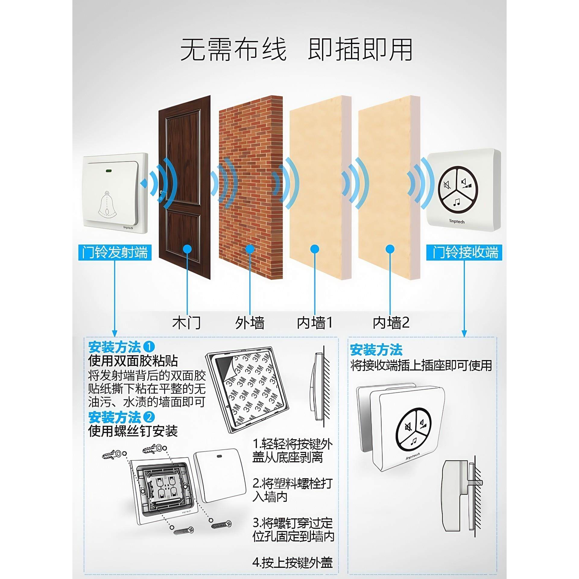 📚 领普无线门铃家用自发电超远距离电子门铃大音量老人呼叫器一拖二