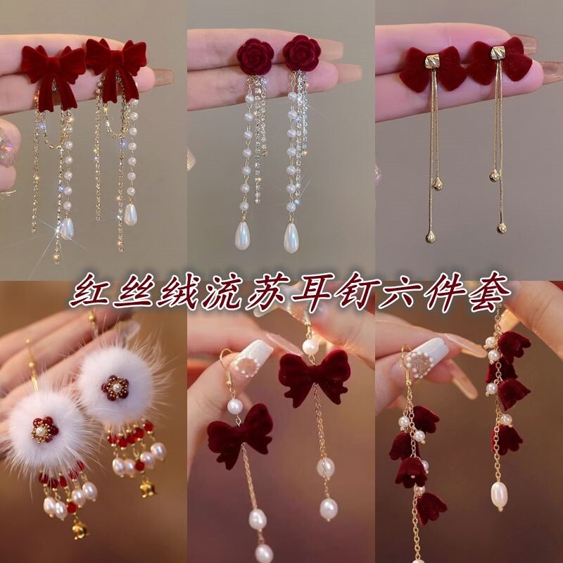📚 高级感红色丝绒流苏耳坠套装配饰秋冬耳饰红丝绒新娘耳钉金属花朵
