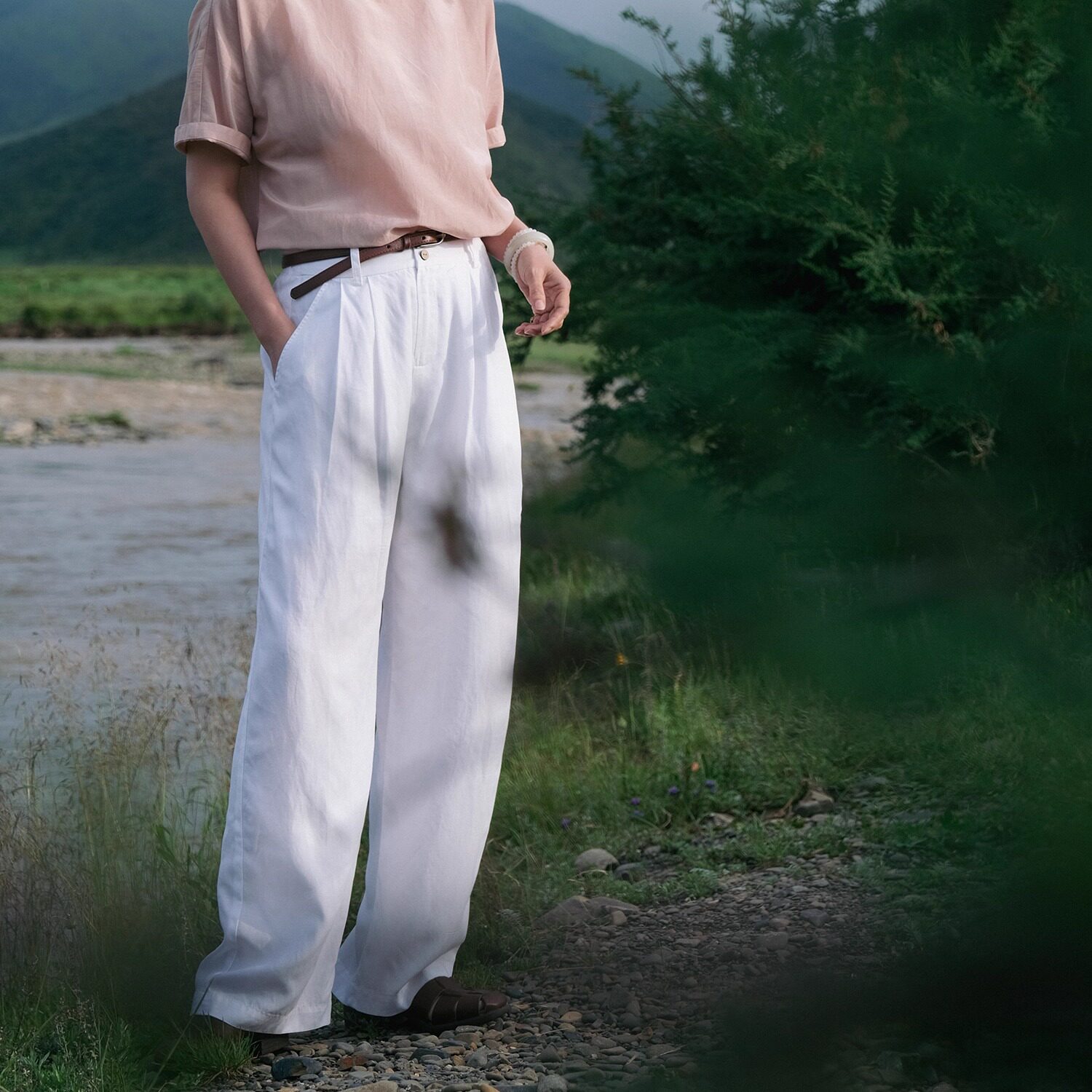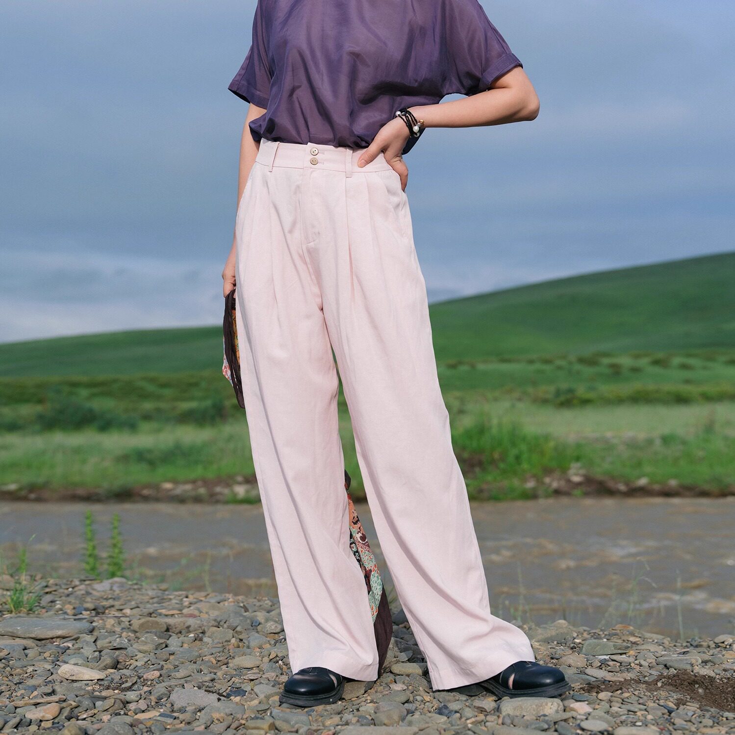 📚 远家 中国色粉白直筒裤垂感长裤半松紧腰 宽松休闲裤HL3990限量