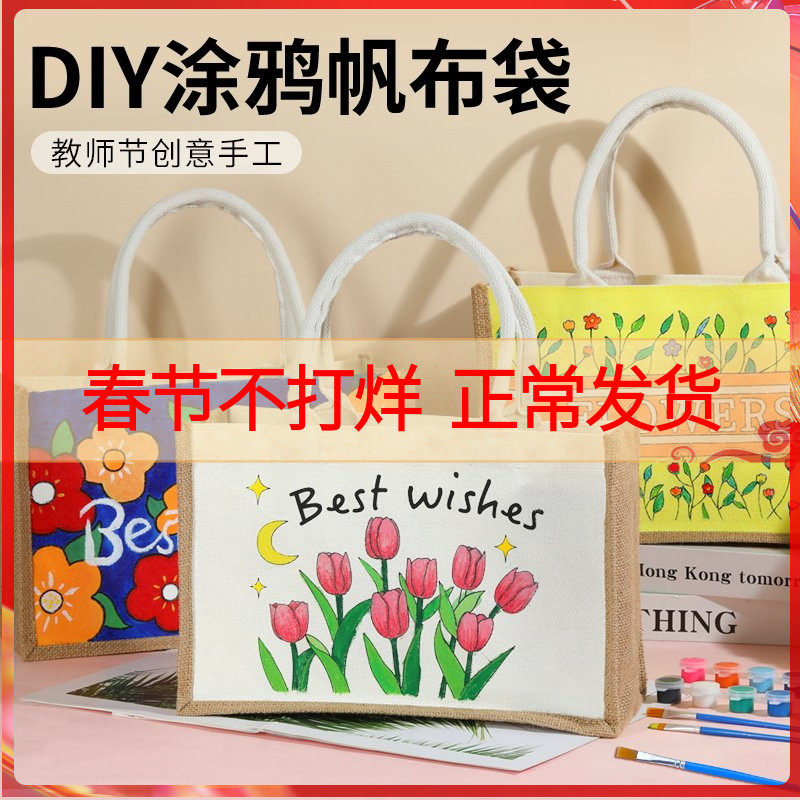 📚 新年手绘线稿帆布包麻布袋儿童涂鸦手工diy绘画手提亚麻包包