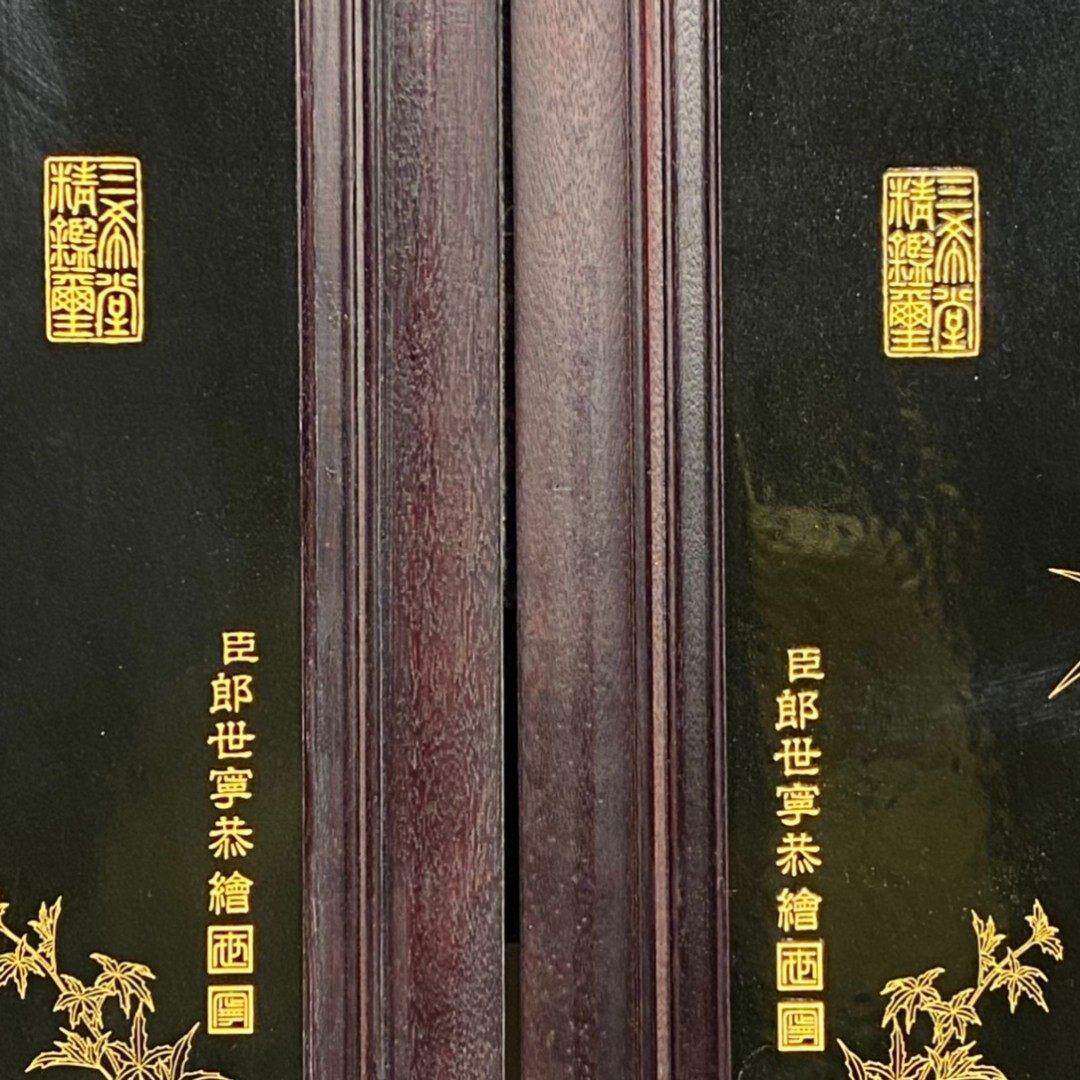 📚 郎世宁作品红实木框镶红底瓷板画掐金丝松鹤延年中堂挂屏风装饰画